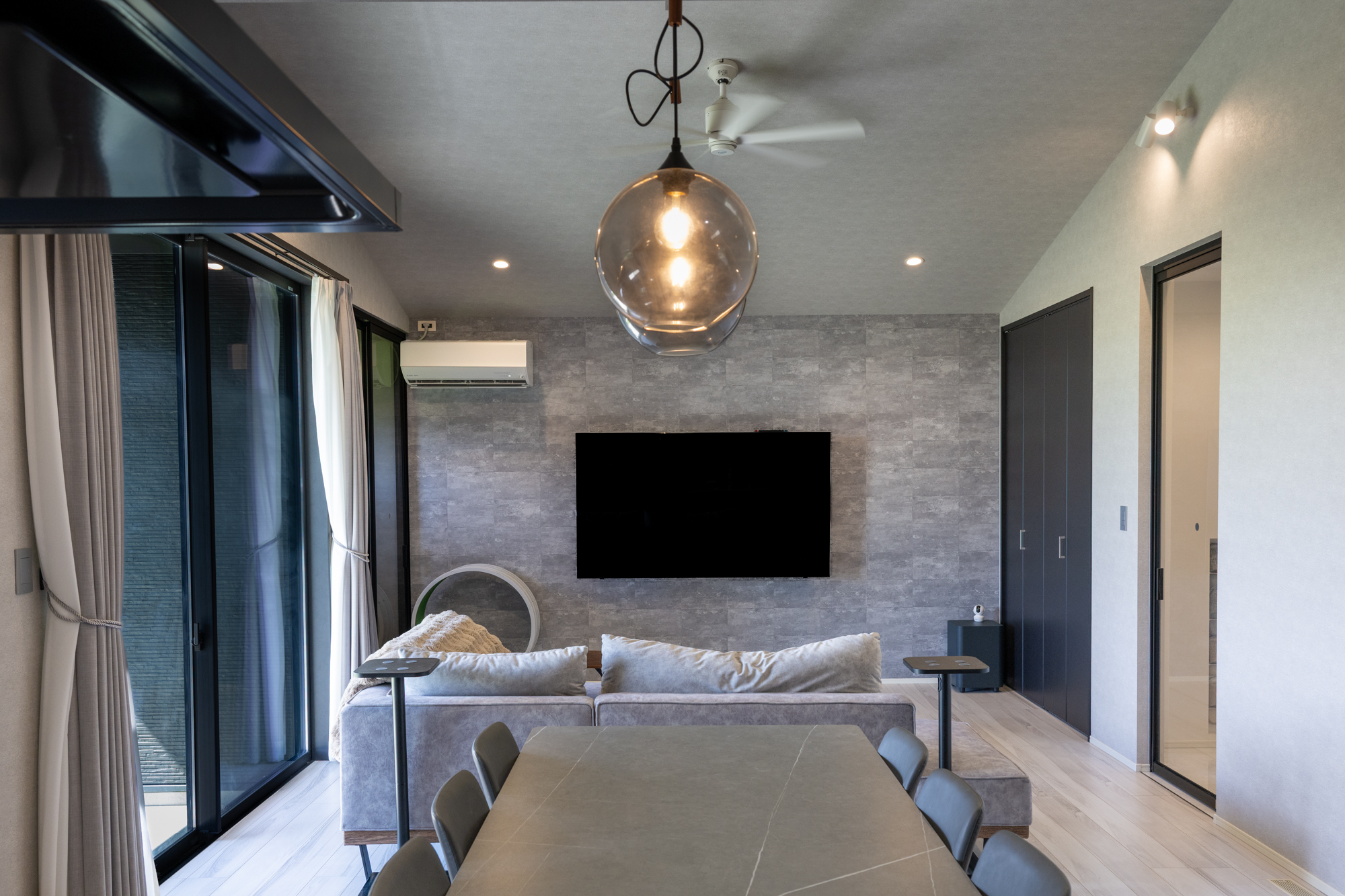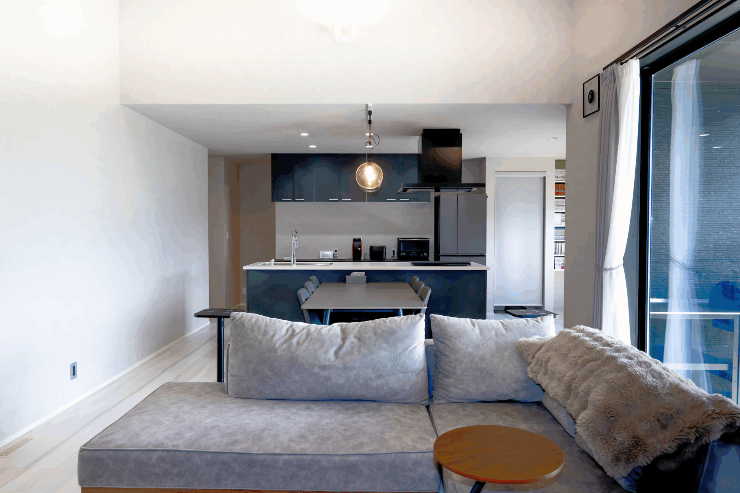 LDKはまるでホテルの一室のような洗練された空間です。キッチン、ダイニング、リビングが一体となったオープンな設計でありながら、「生活感を見せない」デザインを実現。間接照明が作り出す穏やかな光と、選び抜かれた上質な色合いが暮らしをより豊かにしてくれて、お友達を招くのも楽しみに。