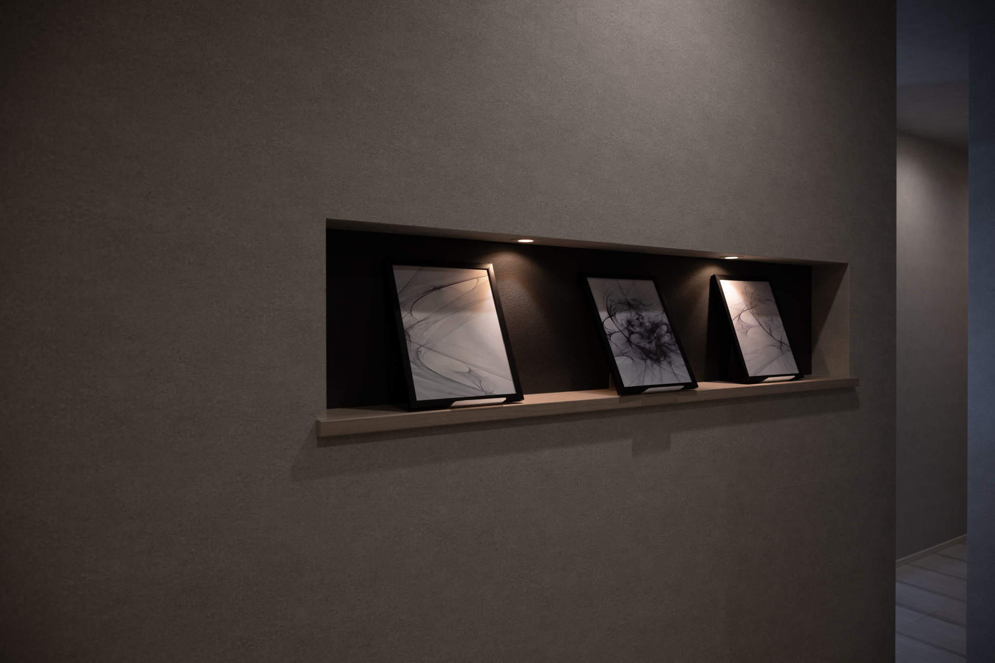 壁面に設けたニッチ(飾り棚)に飾られた絵を、計算された間接照明が優しく照らし出すことで、まるで美術館の一角のような、特別な空間を創り出します。光と影のコントラストが、空間全体に落ち着きと上質な高級感をプラス。住まいに深みのあるアクセントを与え、洗練された大人の雰囲気を演出します。
