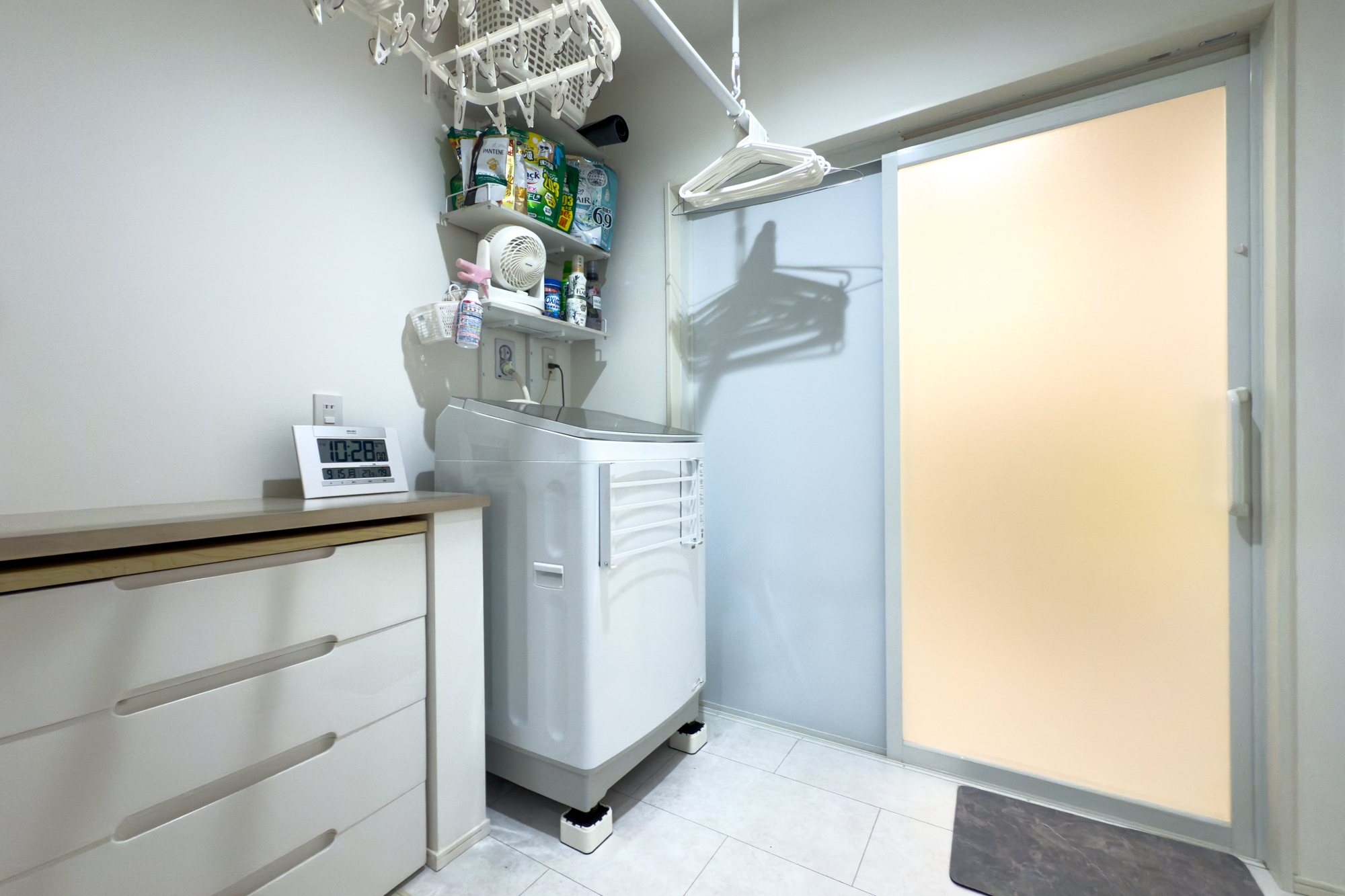 ランドリールームと脱衣所を一体化させた空間は、家事効率を高める工夫が詰まった場所。洗濯から乾燥、収納までがひと続きの動線になっていて、毎日の家事が驚くほど快適に。浴室と隣接しているため、入浴時の着替えやタオルの準備もスムーズ。天井には物干し用のバーが備え付けられ、天候を気にせず洗濯物を干せるのも大きな魅力です。