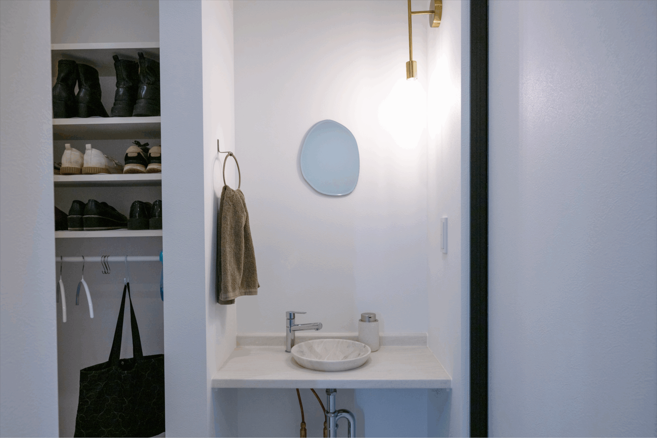 玄関に設けられた造作洗面台は、空間にフィットした洗練されたデザインで上質な雰囲気を添えます。来客時にも自然に使える配置で、手洗いや身だしなみのチェックがスムーズに行える実用性も兼備。美しさと使いやすさを両立した、玄関のアクセントとなっています。
