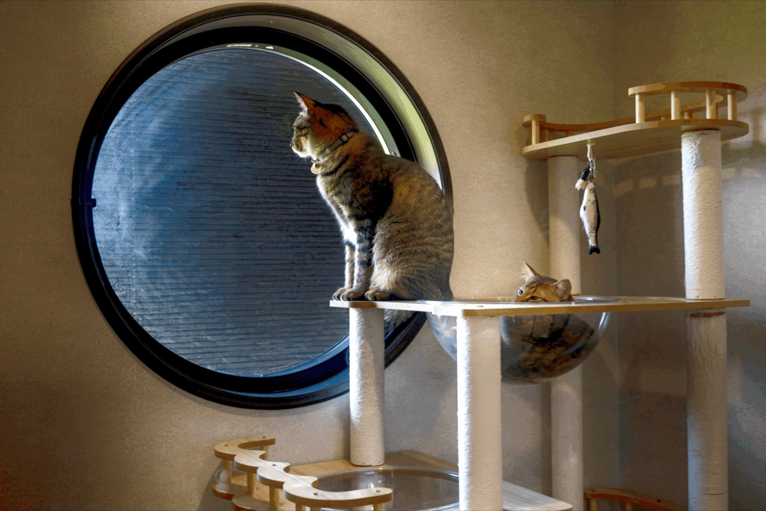 大好きな猫ちゃんたちが安全に、そして心ゆくまでリラックスできる専用のキャットルームです。3匹がそれぞれお気に入りの場所を見つけられるよう、多層のキャットウォークや日当たりが良くてこだわりの丸窓に工夫を凝らしました。消臭機能やお手入れのしやすさも考慮した設計で、飼い主さんも安心。