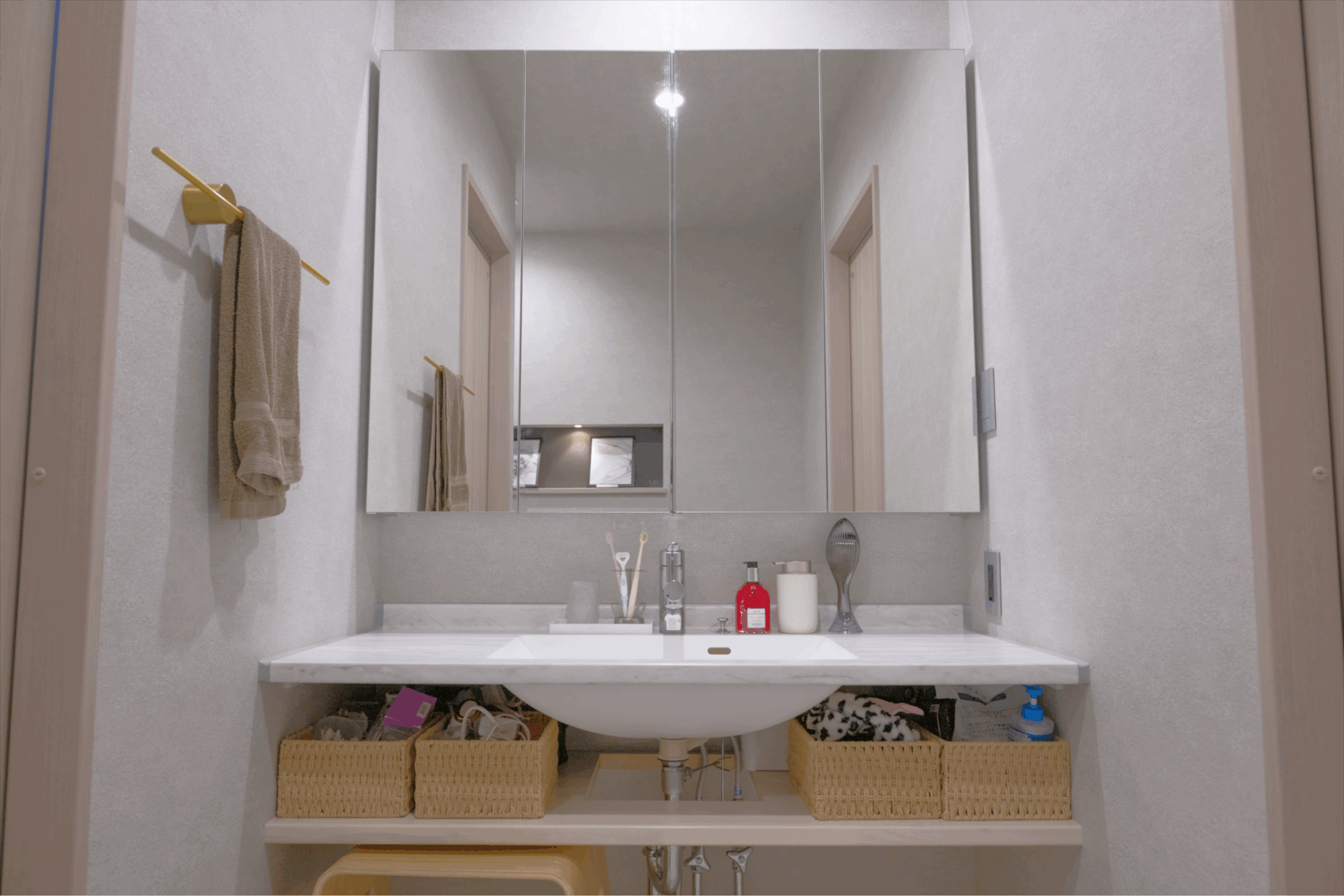 通常の洗面台よりもワイドな設計を採用することで、忙しい朝の身支度にもゆとりが生まれます。空間全体が洗練されたホテルライクな雰囲気に演出されており、機能的でありながら、心まで満たされるような特別感を得られます。