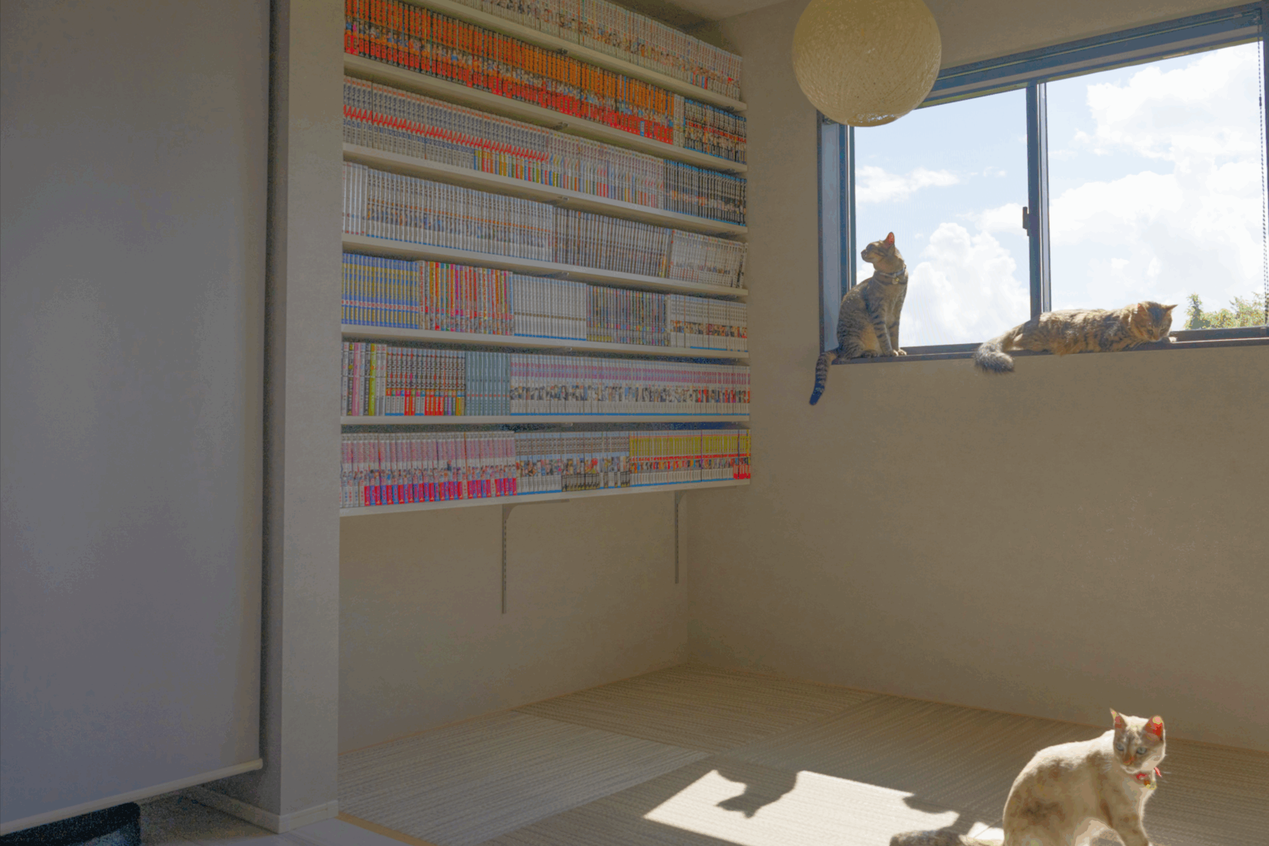壁一面にずらりと並ぶご主人自慢のコミックが壮観な、書斎を兼ねた特別な和室です。落ち着いた畳の空間で、大好きな漫画に囲まれながら、心ゆくまで読書に没頭する時間は、まさに至福のひととき。気がつけば大好きな猫ちゃんも隣に寄り添っていることもしばしば。