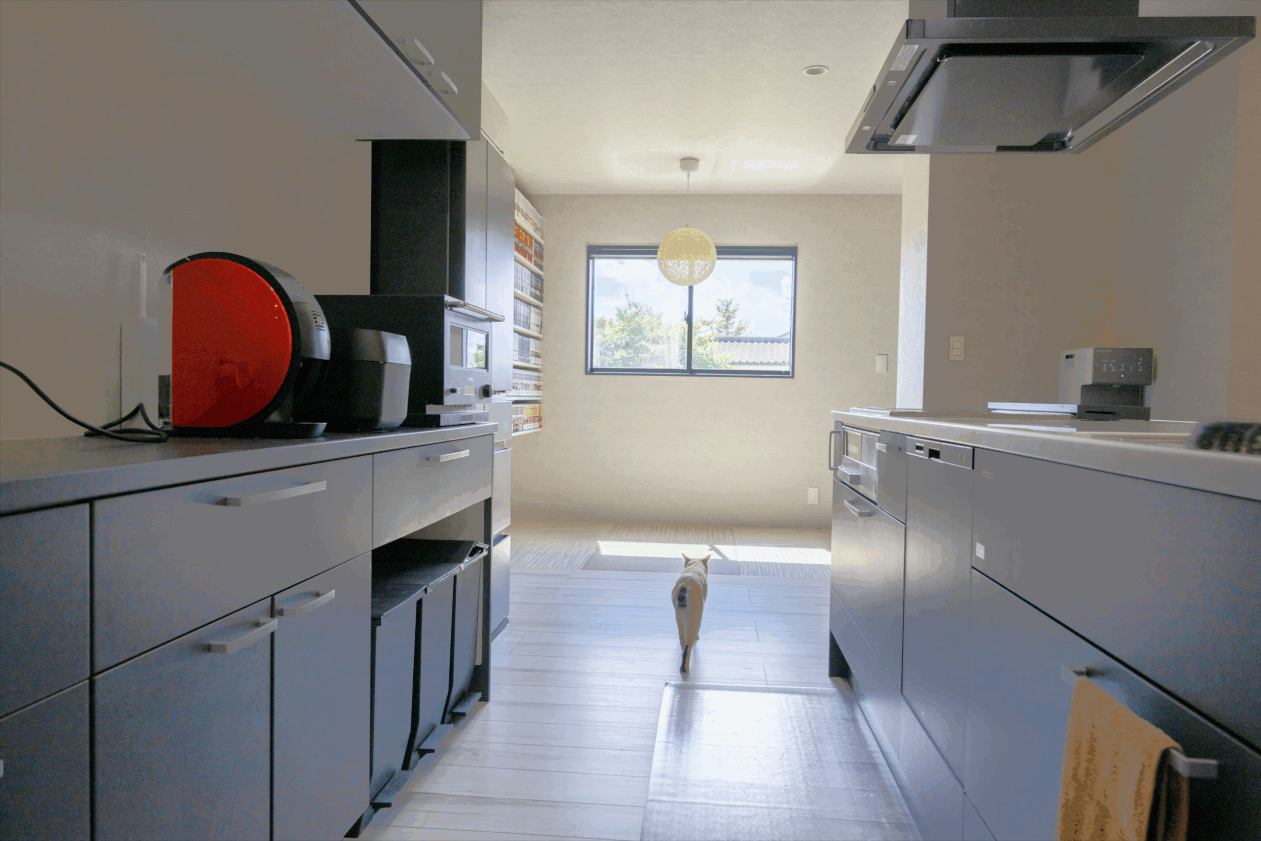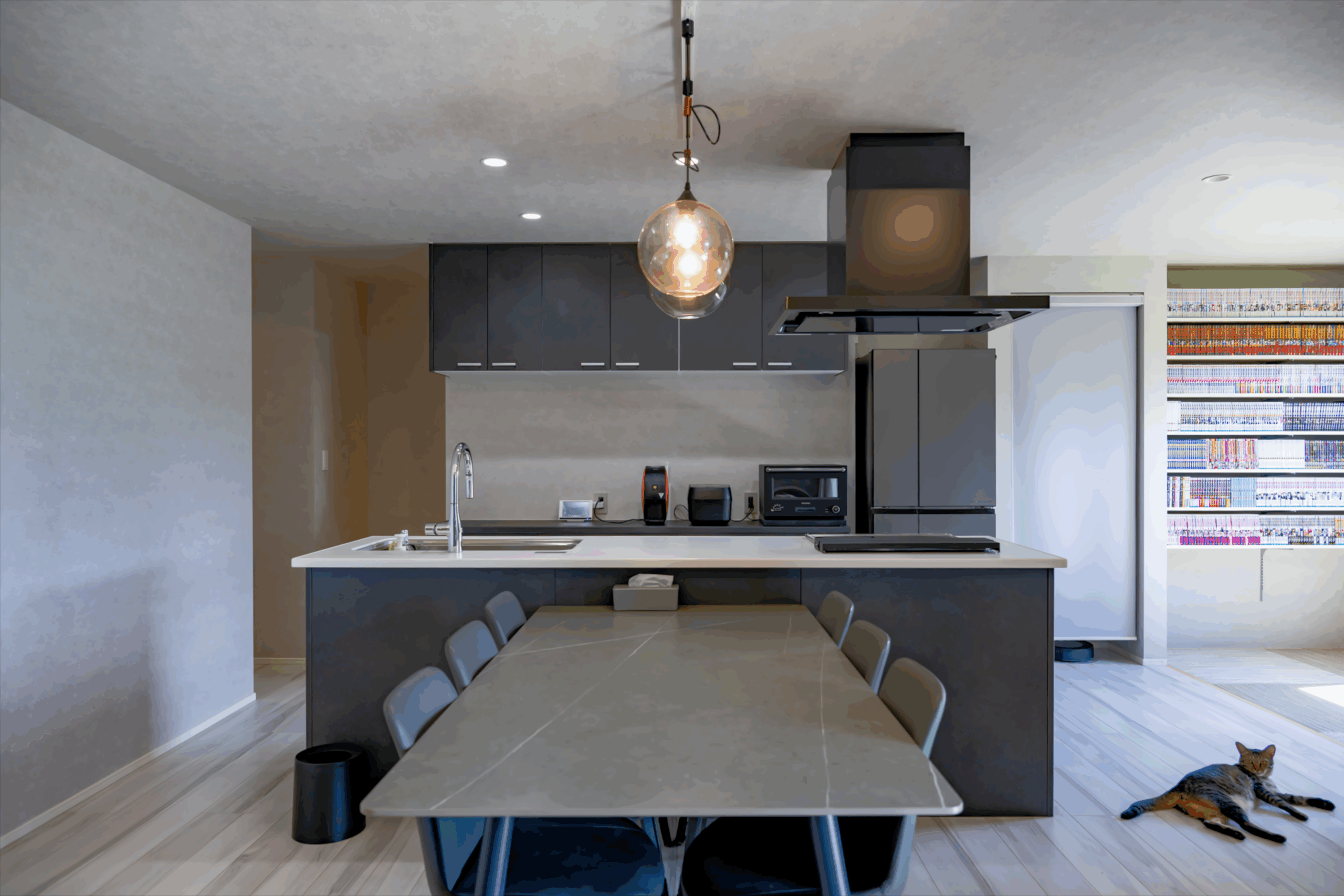ダークカラーで統一されたキッチンは、まるでホテルのバーカウンターのような重厚感と上質さ。可能な限り生活感を排除したデザインと機能美が融合しており、毎日の料理も特別な時間にしてくれます。料理中や食後に、リビングでくつろぐ愛らしい3匹の猫たちの姿も視界に入ります。