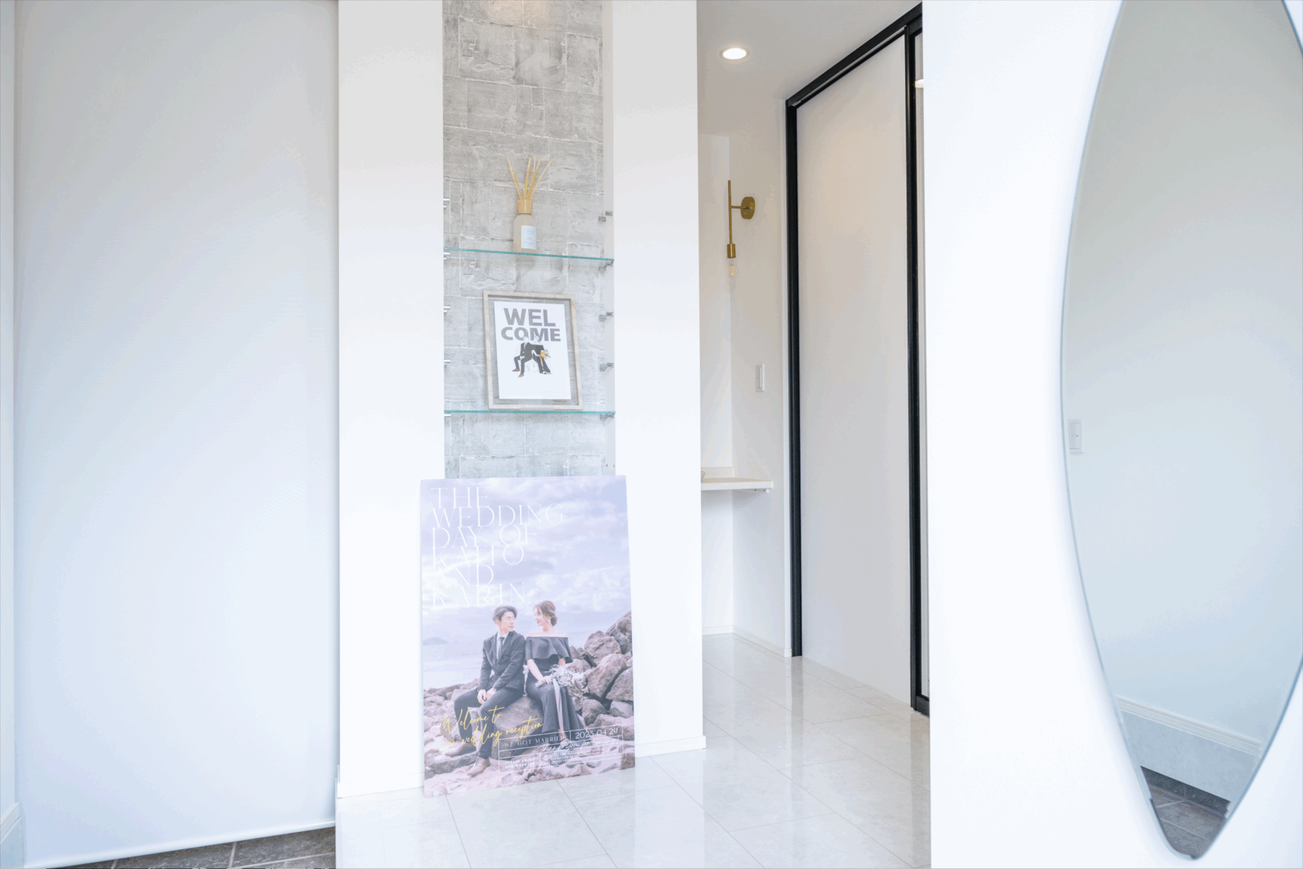 白を基調にした玄関は、光をやさしく反射して空間全体を明るく見せるとともに、開放感を演出します。シンプルで洗練された色使いが、訪れる人を爽やかに迎える心地よい雰囲気をつくり出しています。