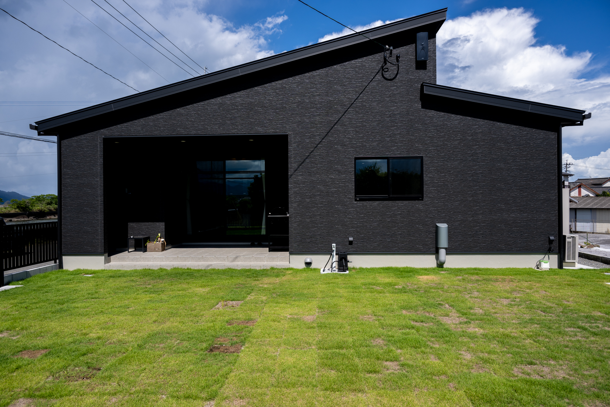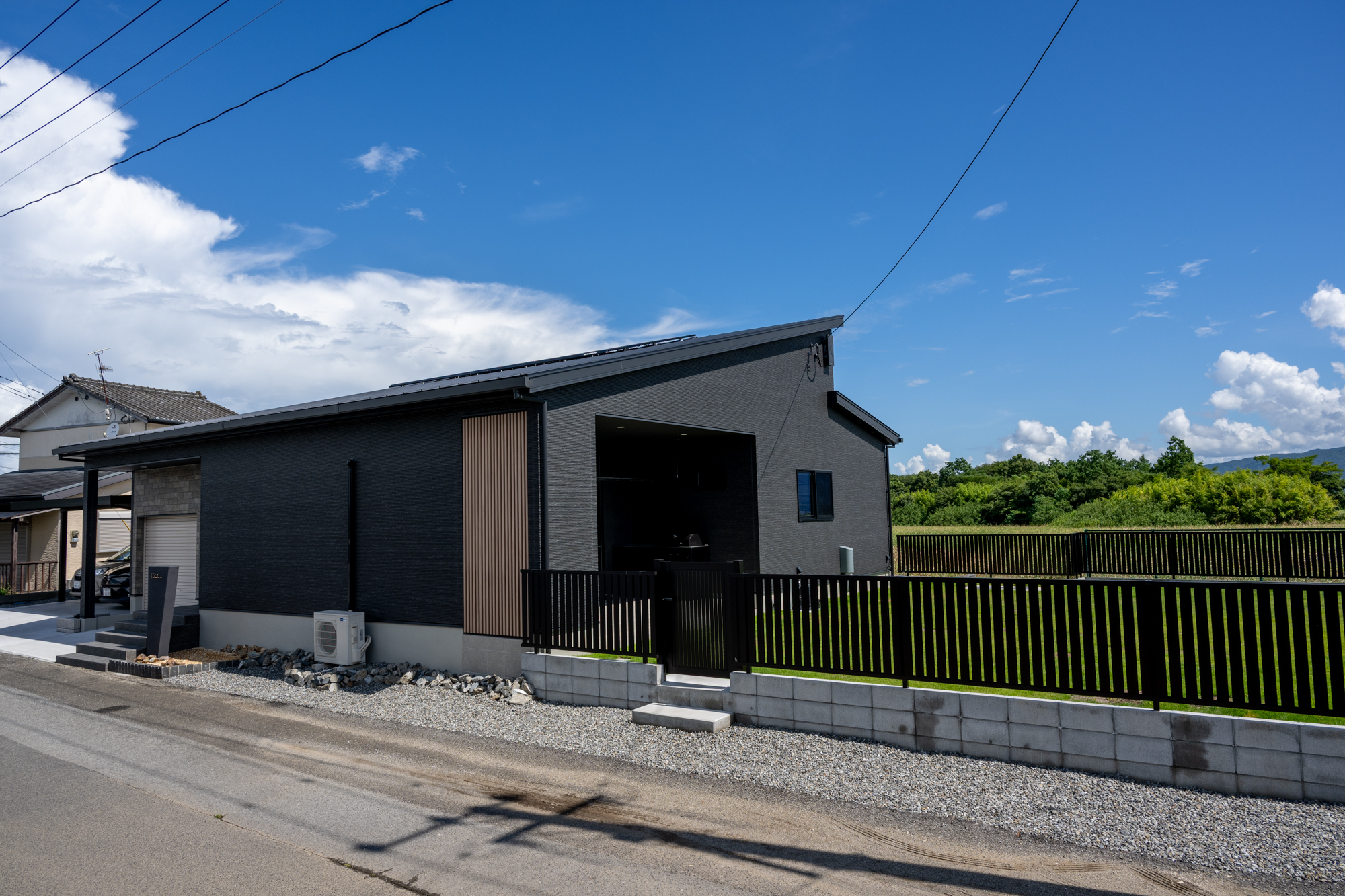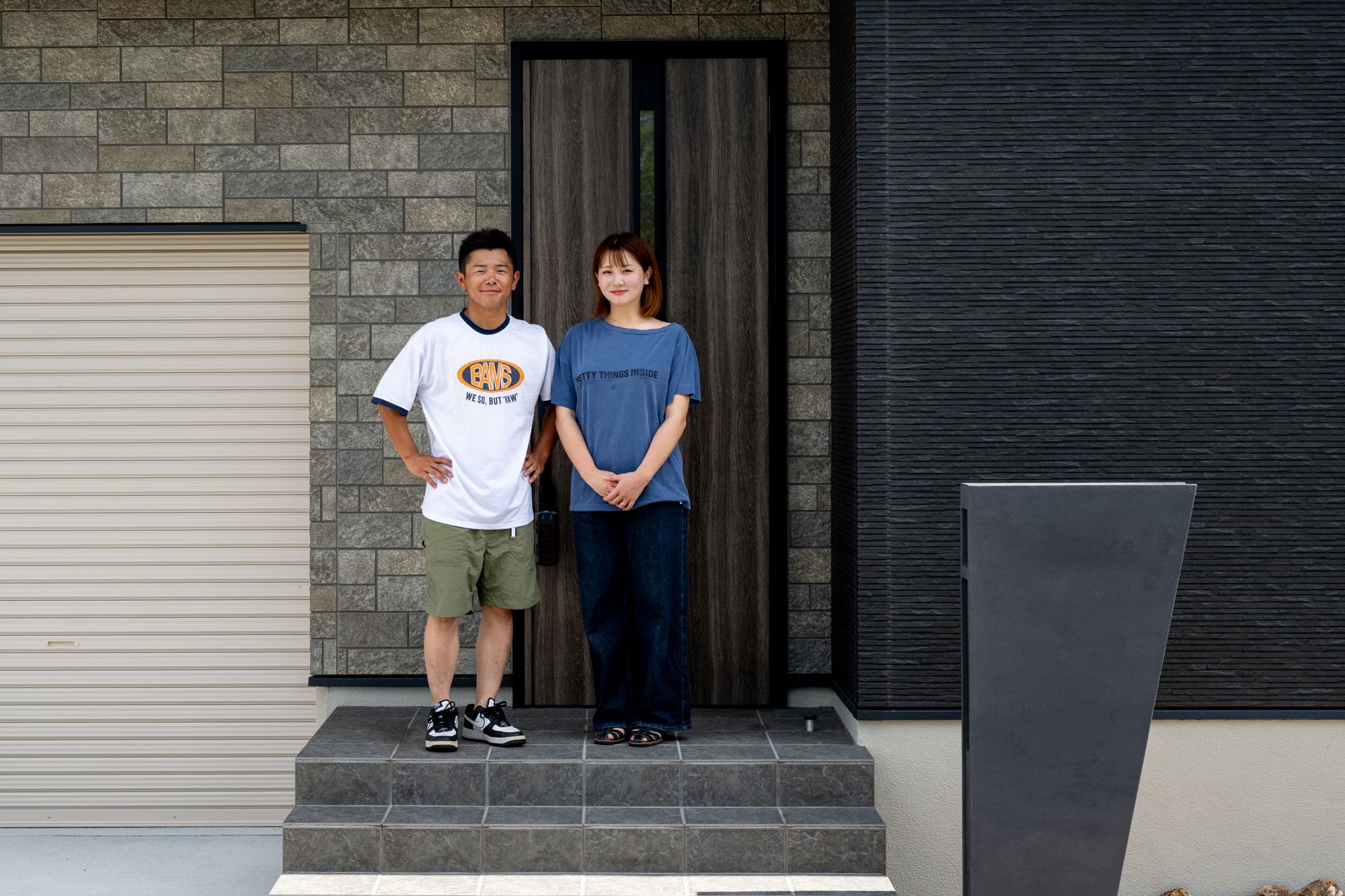 住まいの第一印象を決定づける門扉にも、おしゃれでシックなダークカラーを採用しました。上質な素材感と落ち着いた色合いが、建物や外構全体をモダンで洗練された雰囲気に引き締めており、格調高いエントランスを演出します。
