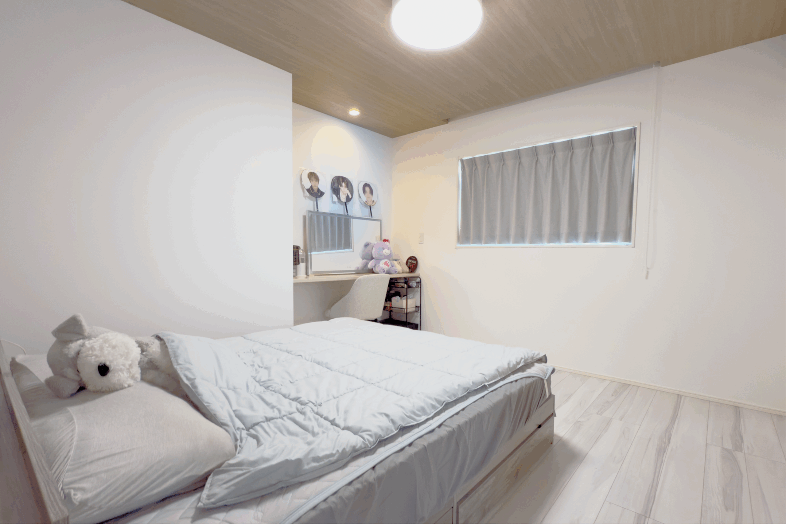 白を基調に統一された主寝室は、清潔感あふれる明るさが広がり、心を落ち着かせる空間を演出します。余裕のある広々とした間取りが、開放感とゆとりを感じさせ、日常を忘れてリラックスできる上質な時間をもたらします。