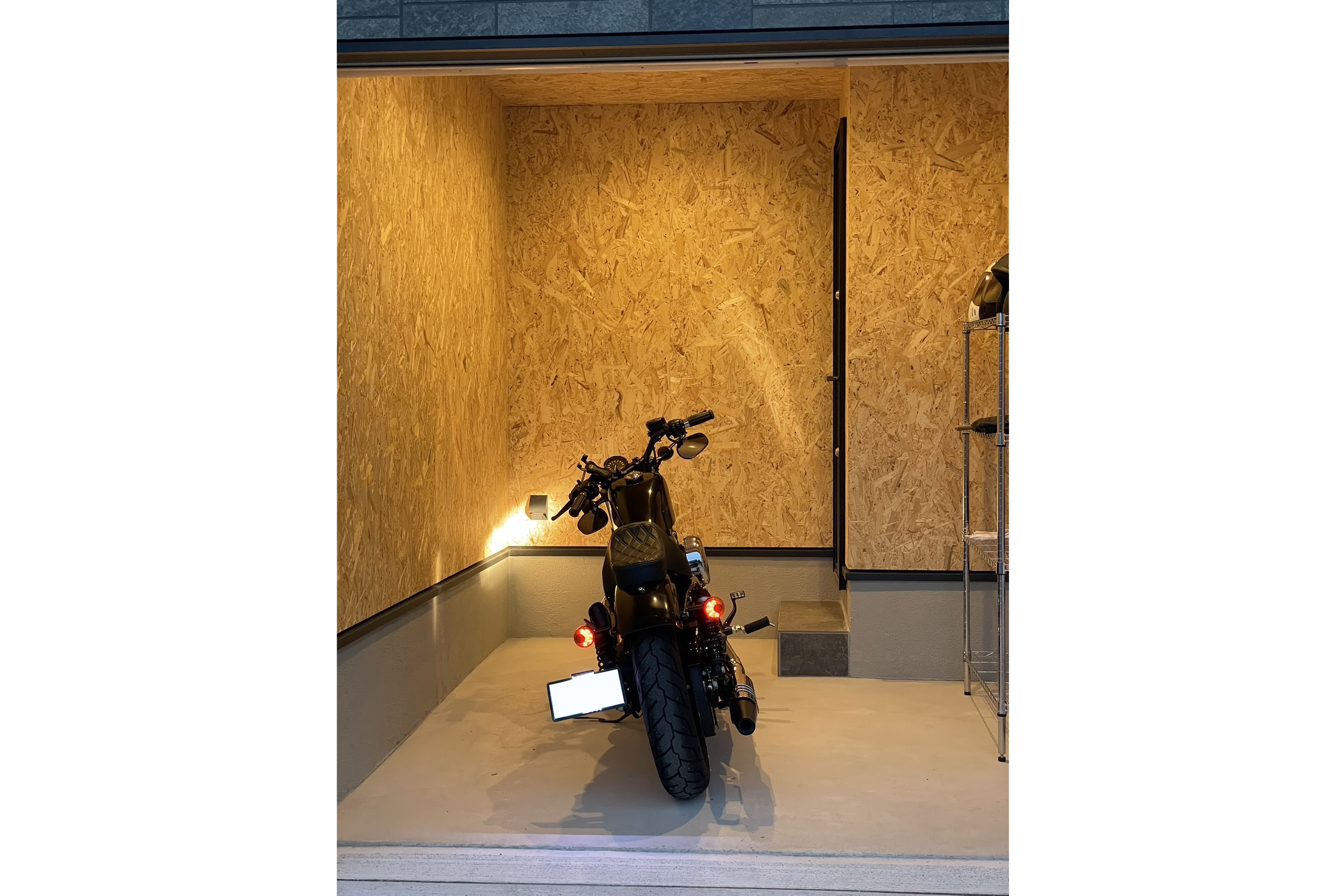 こだわりが息づくバイクガレージ。中央には自慢のハーレーがゆったりと置かれ、使い込まれた工具やお気に入りのパーツが心地よく並んでいて、整然としながらも温かみが感じられる空間に。眺めているだけで満足感を感じられる時間が流れます。