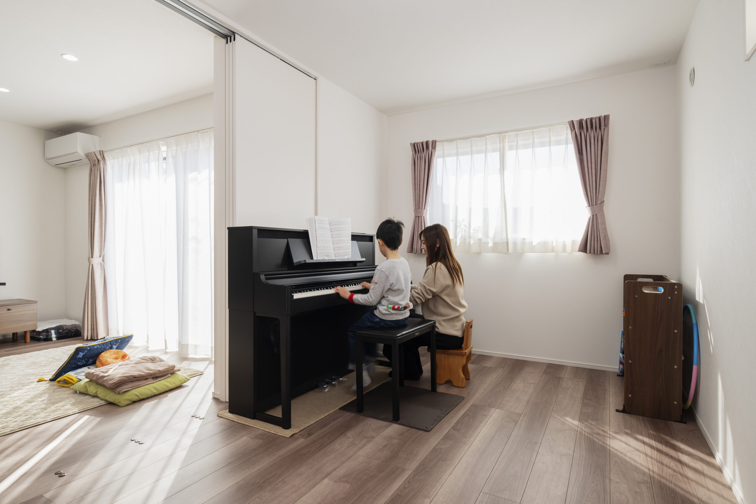 奥さまの優しい指導のもと、楽しそうにピアノを弾くお子さまと過ごす子ども部屋。開放的なスライドドアを採用したことで、ダイニングでひと息つく旦那さまからもそっと見守れる間取りになっています。