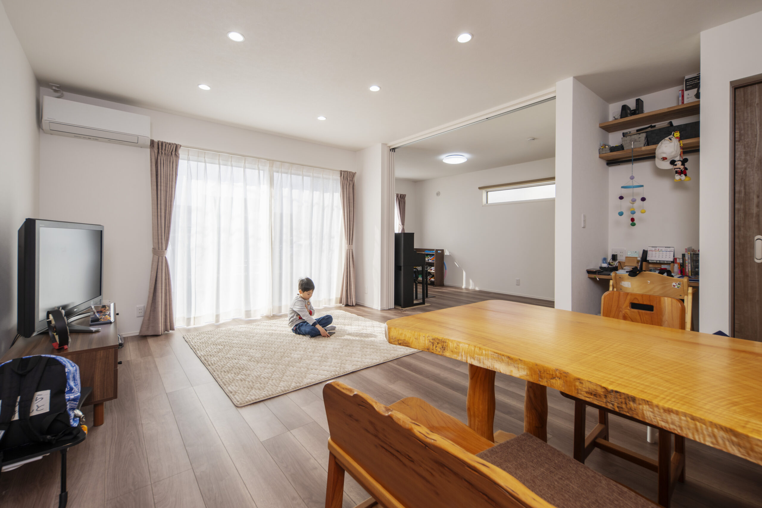コンパクトながらも開放感のあるリビングは、子ども部屋のドアを大きなスライド式にしたことで実現した間取り。将来お子さまが独立したあとも使い方を柔軟に変えられるよう、暮らしの先まで見据えて設計されています。自然と、お子さまの“特等席”はリビングに。