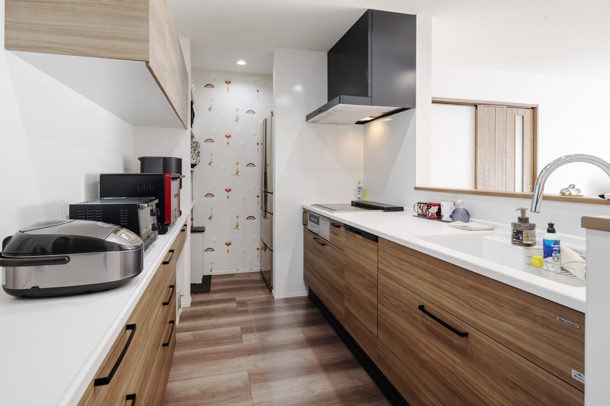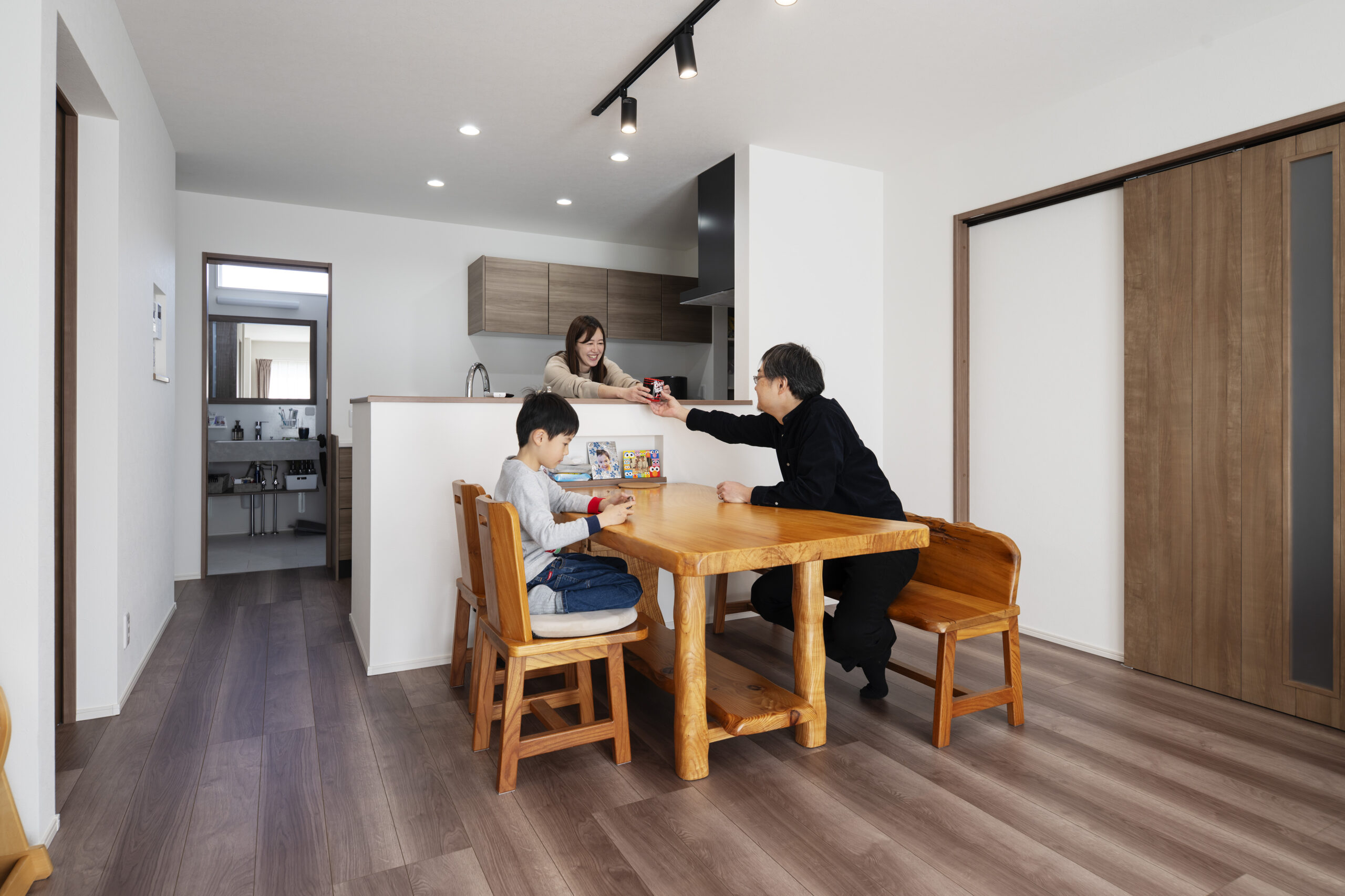 対面式のキッチンは、家全体を見渡せる奥さまのとっておきの場所。“手の届く距離感”で交わす会話や、同じ空間で過ごす穏やかな時間が、家族の絆を育んでいきます。コンパクトな間取りだからこそ叶う、理想的な暮らしのかたちです。