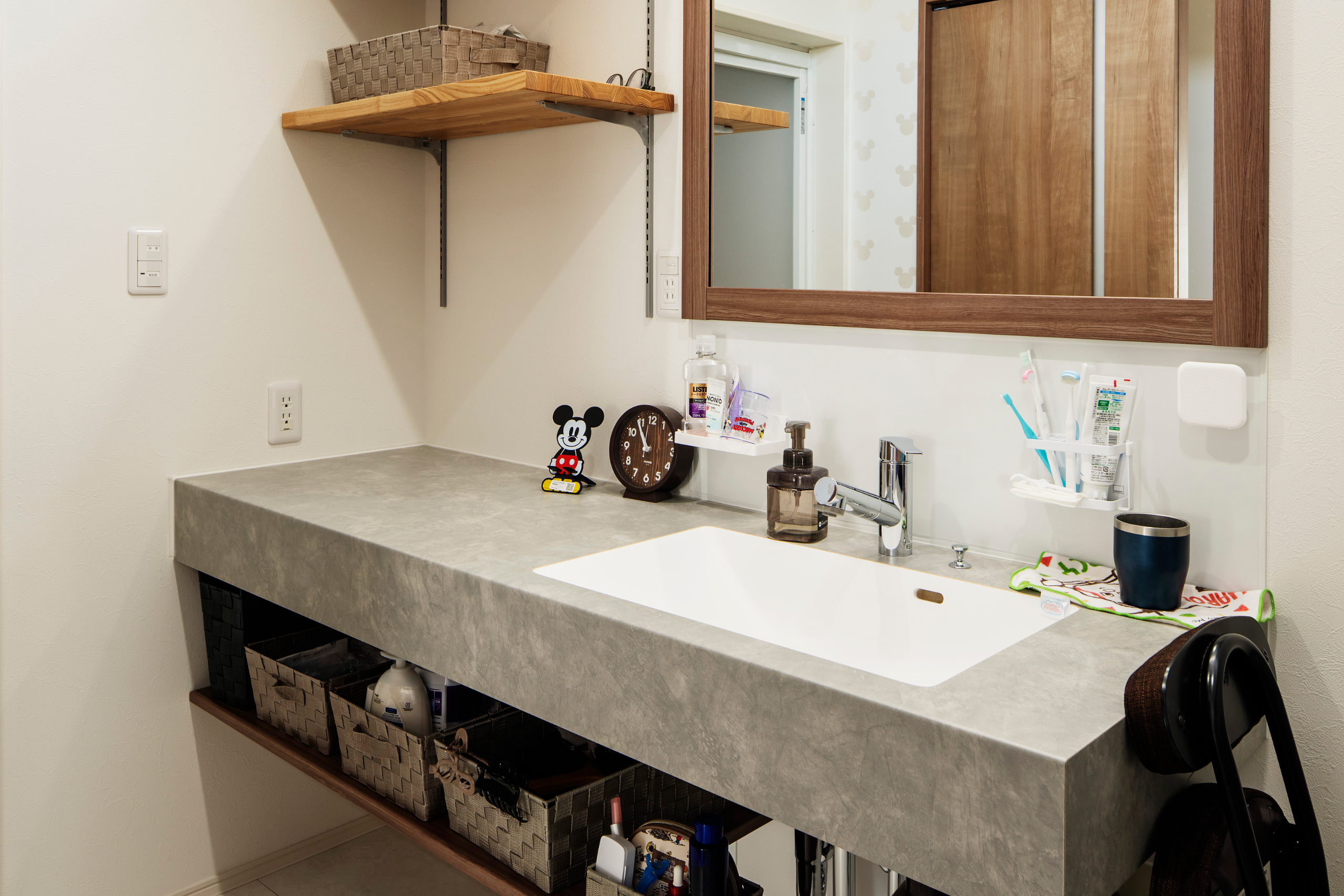 奥さまのお気に入りのひとつであるパウダールーム。収納力をしっかり確保しながら、白を基調とした洗練された空間に。可動式の棚を設けたことで、お子さまの成長に合わせて使い方を柔軟にアレンジできるようになっています。