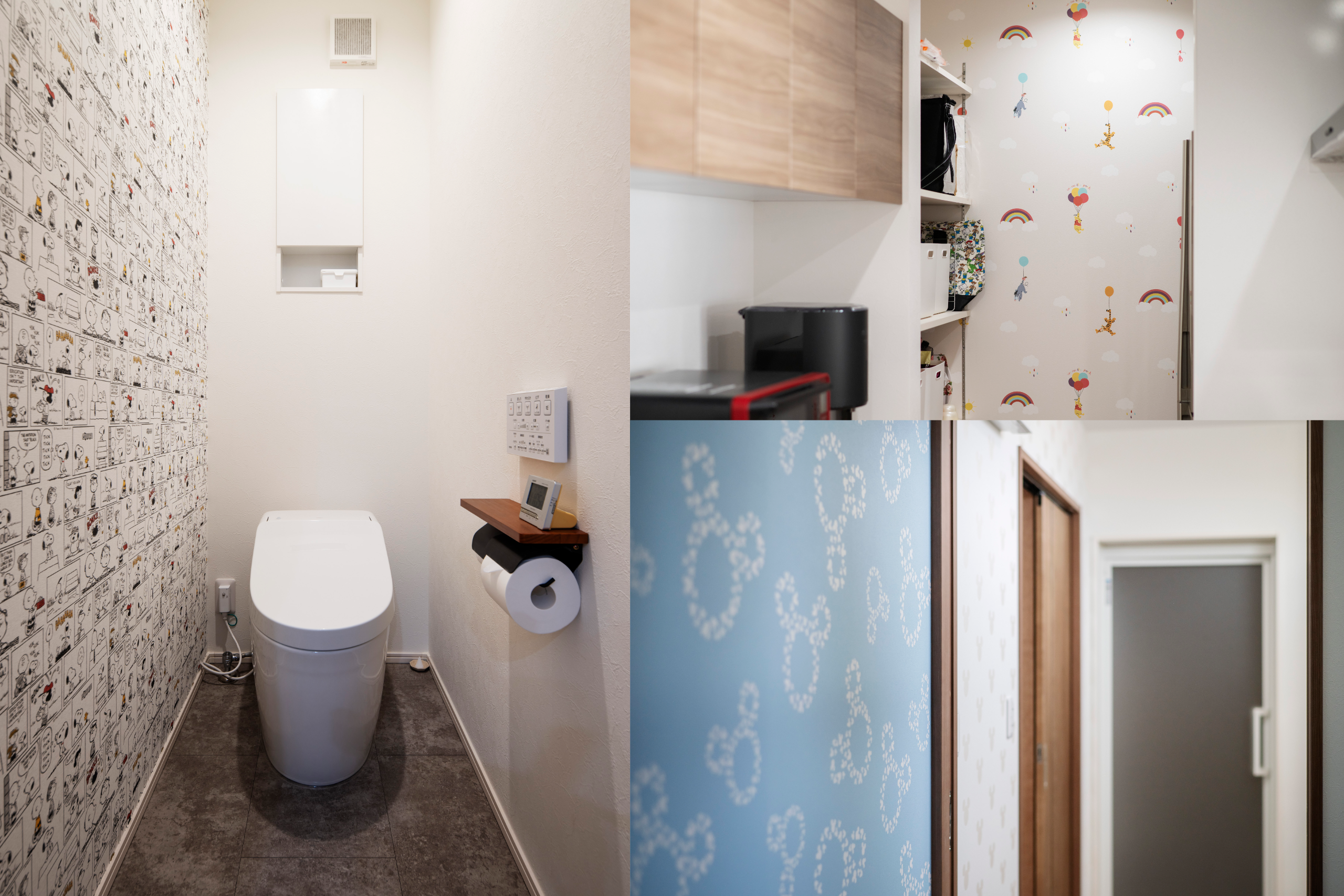 シンプルな空間に散りばめられた壁紙は、奥様が大好きなキャラクターで遊び心のバランスもGOOD! 玄関には、旦那さまとお子さまが好きな乗り物の飾りつけが並び、家族らしい個性をやわらかく彩っています。