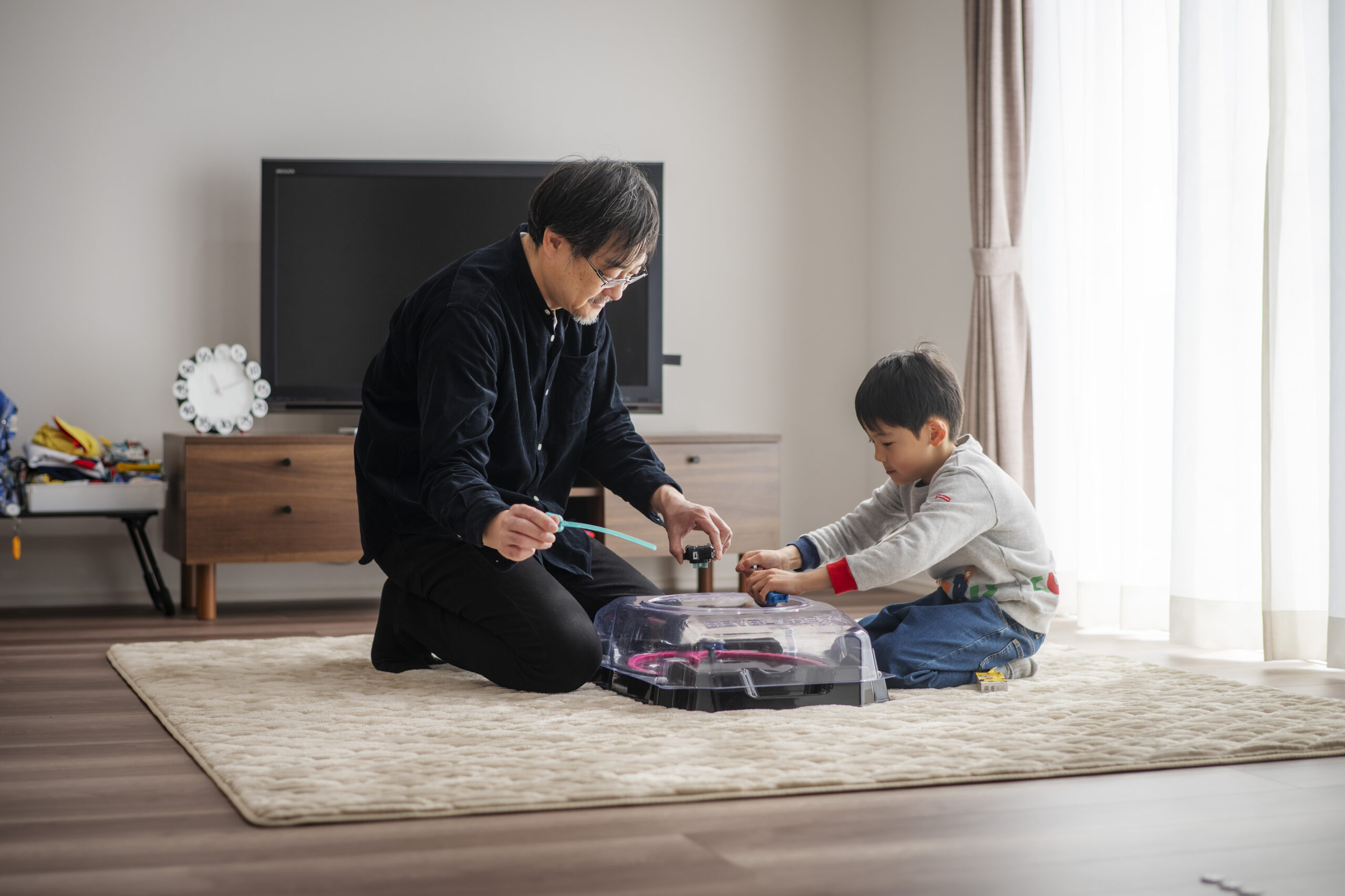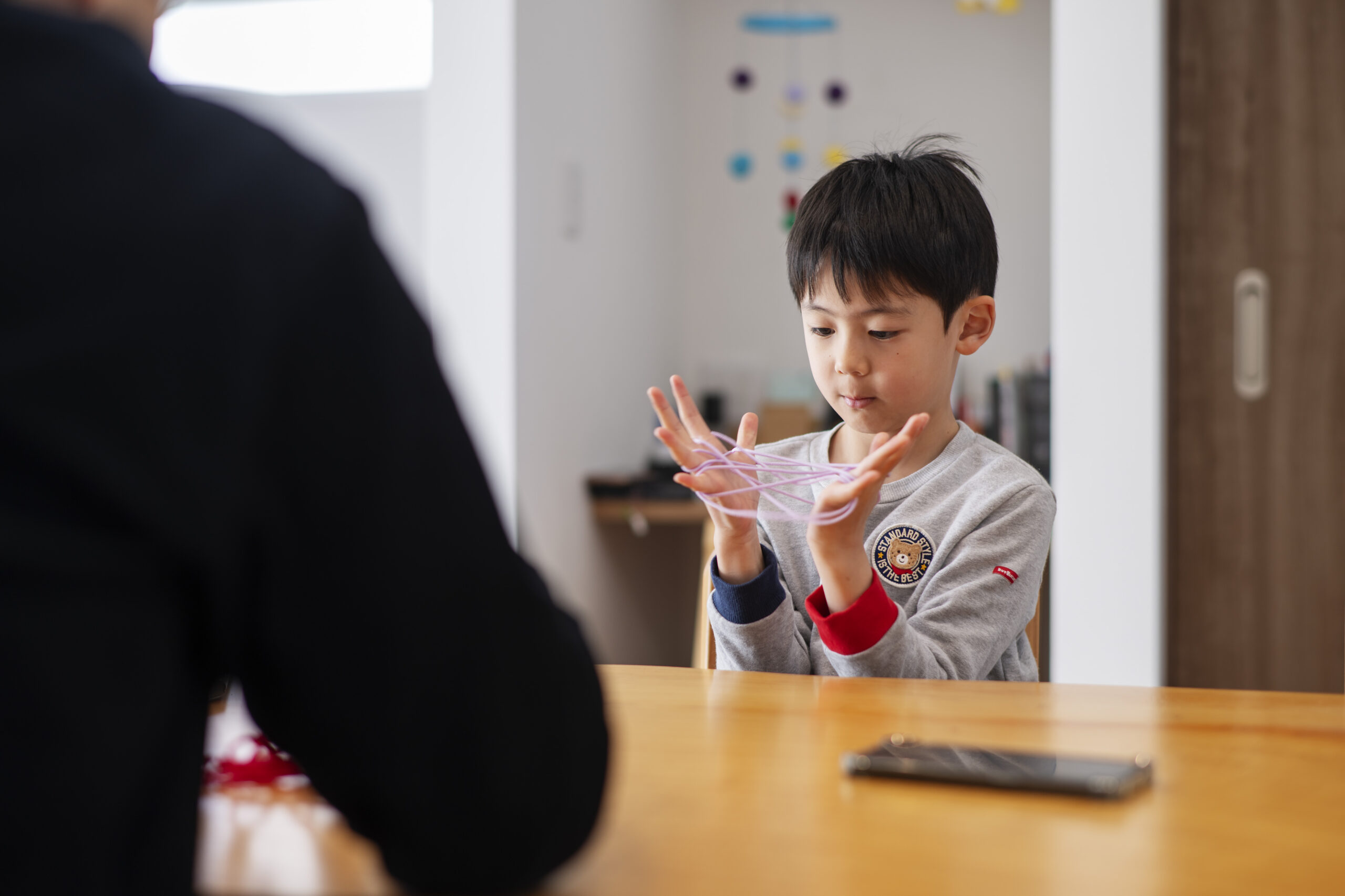 保育園で大流行中の“あやとり”を披露してくれたR君。お施主さまのお時間が迫るなか、インタビュアーのわがままで、気づけばR君と二人であやとりに夢中に(笑)。ふたりで協力しなければ完成しない技まで習得し、インタビュアーも大満足のひとときになりました。