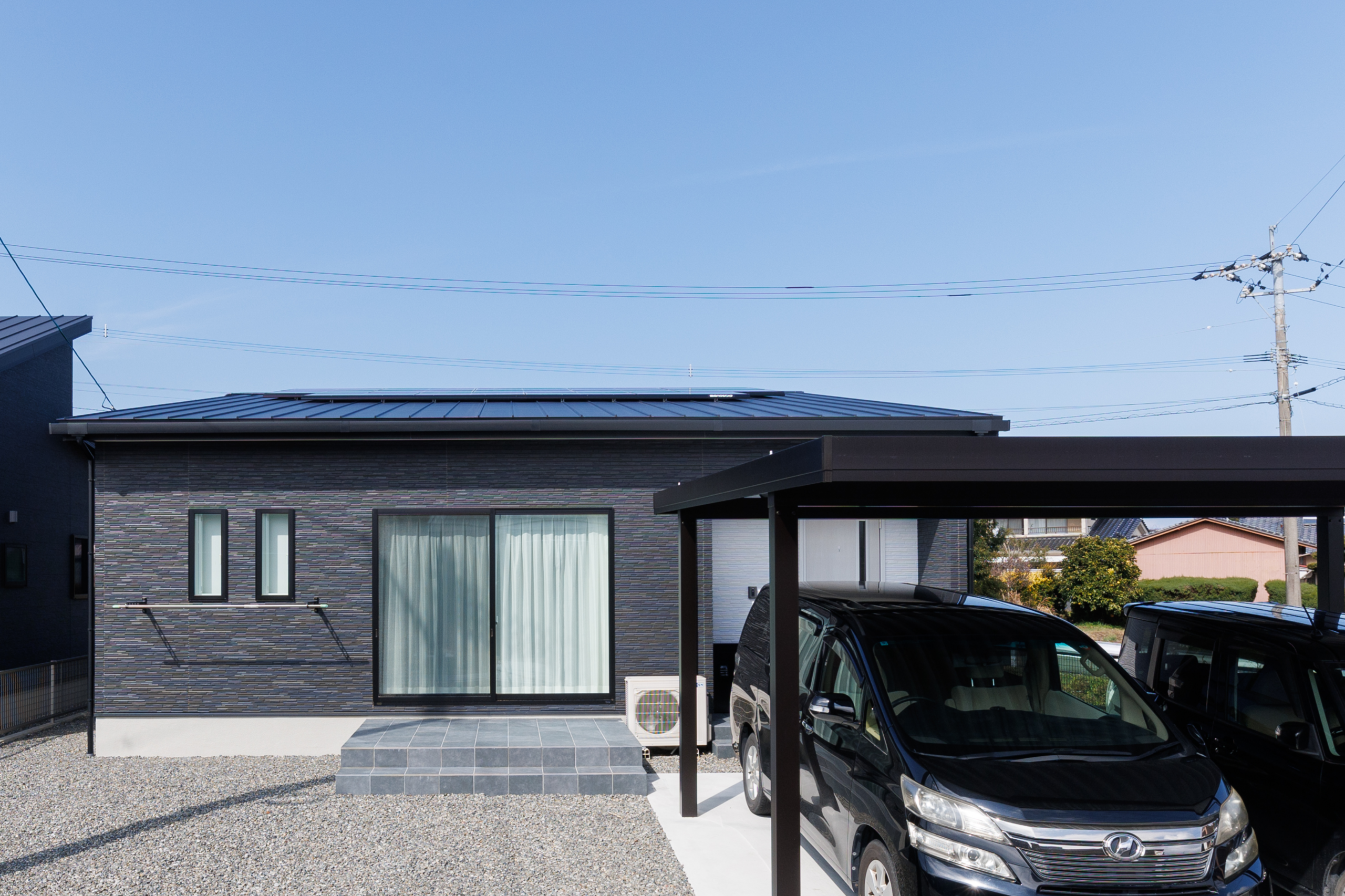 重厚なダーク色の外壁と直線的な屋根が描く、洗練されたシルエット。窓枠やカーポートも黒で統一し、細部までスタイリッシュに仕上げました。青空に映える、シンプルでありながら圧倒的な存在感を放つ外観デザインです。