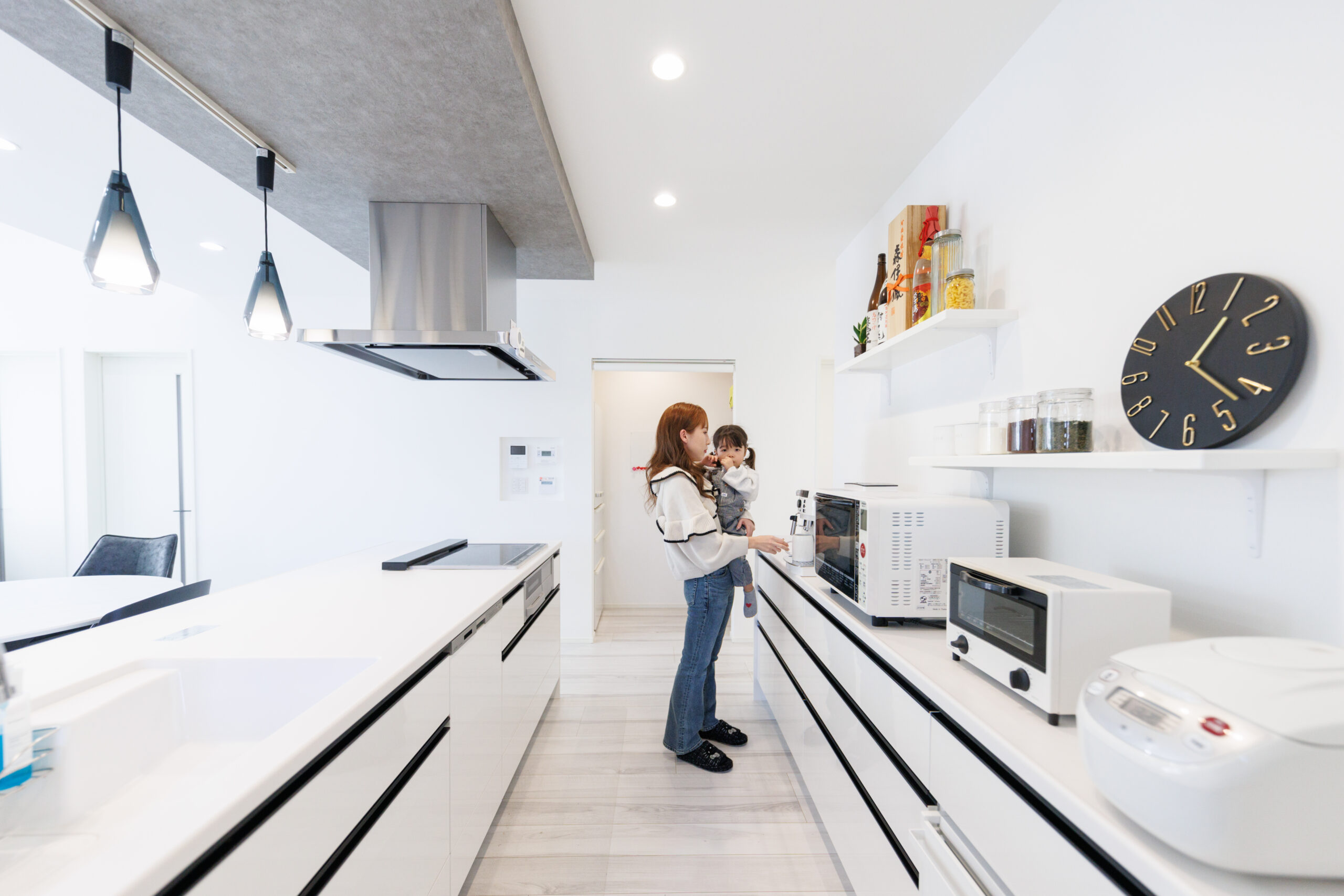 「後ろ通っていい?」の声かけがいらない、通路幅にゆとりを持たせたキッチン。夫婦で並んで作業するときも、お子さまとお菓子作りをするときも窮屈さを感じません。すれ違いもスムーズな広々動線が、毎日の料理をストレスフリーな時間に変えてくれます。