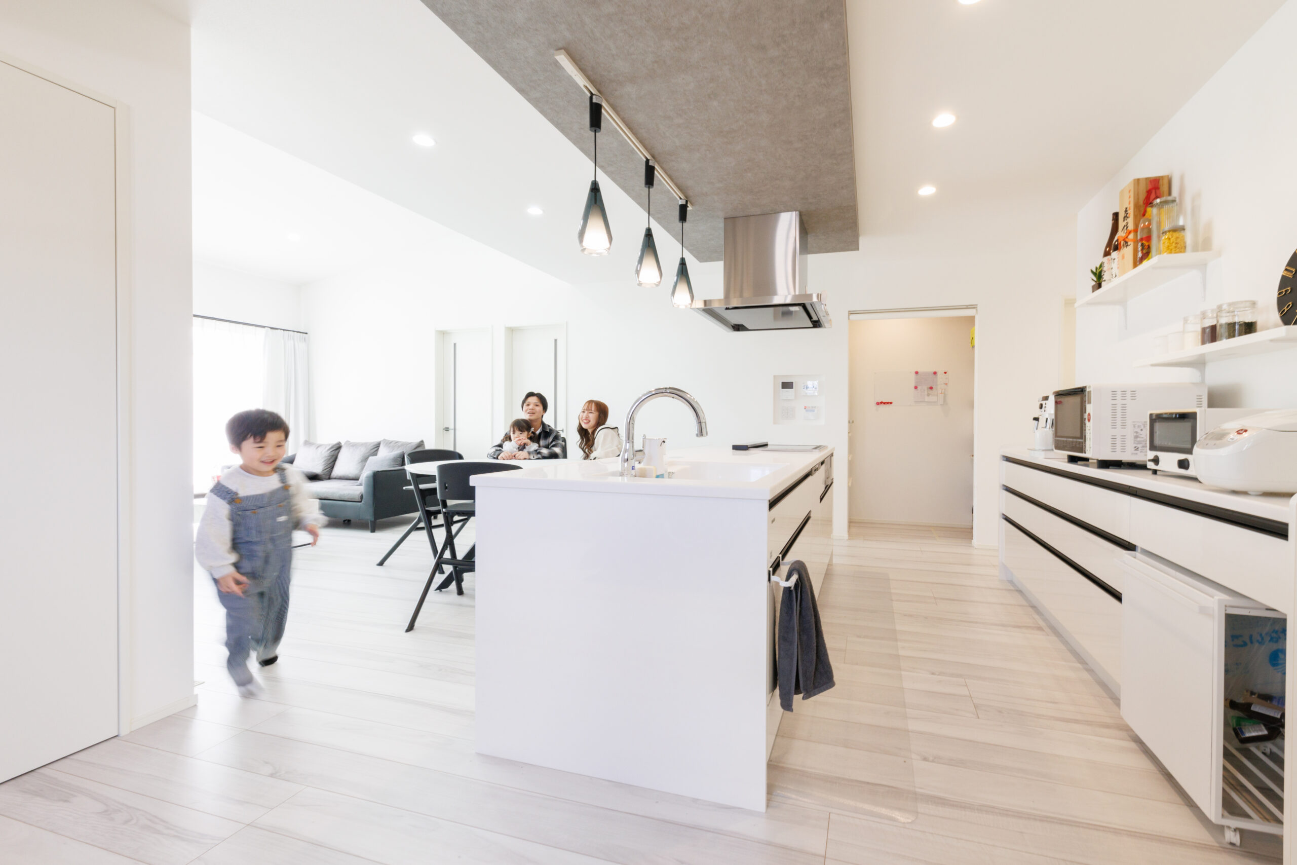 行き止まりのないアイランドキッチンは、家事ラク動線であると同時に、子どもたちの最高の遊び場!ぐるぐる走り回れる回遊性は、わんぱくな心を受け止める広さの証。料理中も子どもの気配をいつでも感じられる、安心の設計です。