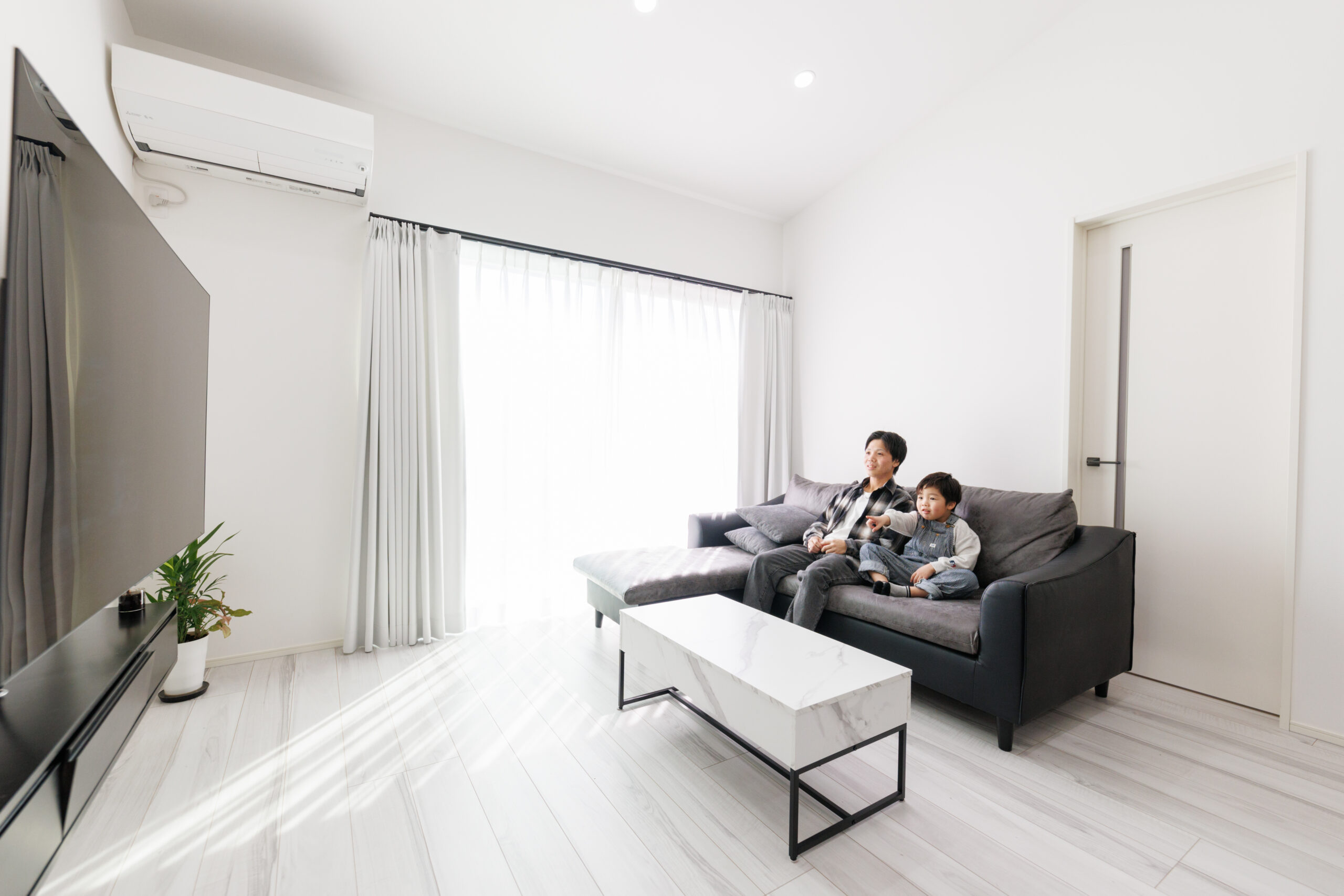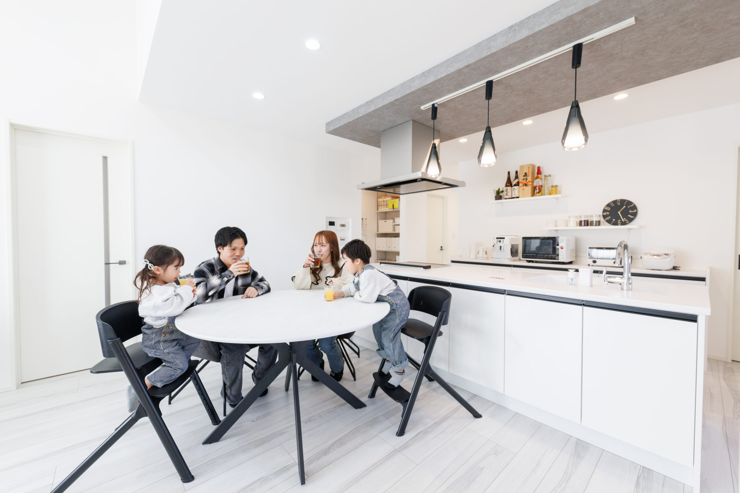 重厚なダークカラーの外観とは対照的に、家の中に入ると白を基調にした明るく開放的な空間が広がります。外観のクールさと、家族を温かく包み込む明るいリビング。その心地よいギャップが、この住まいの大きな魅力です。