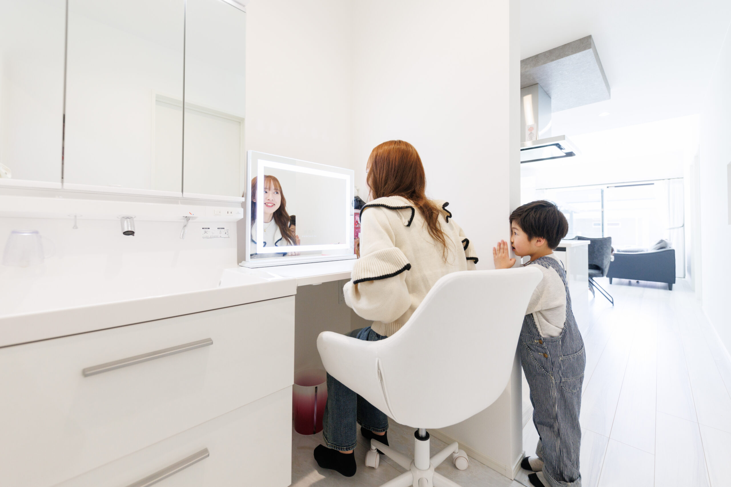 毎日を輝かせる、奥さまだけの特等席。リビングの一角にありながら、程よく視線が外れるので、落ち着いて「自分時間」を楽しめます。イスを少し引けば、遊ぶ子どもたちの笑顔が見える安心の距離感。家族の気配を感じながら美を磨ける、幸せな場所です。