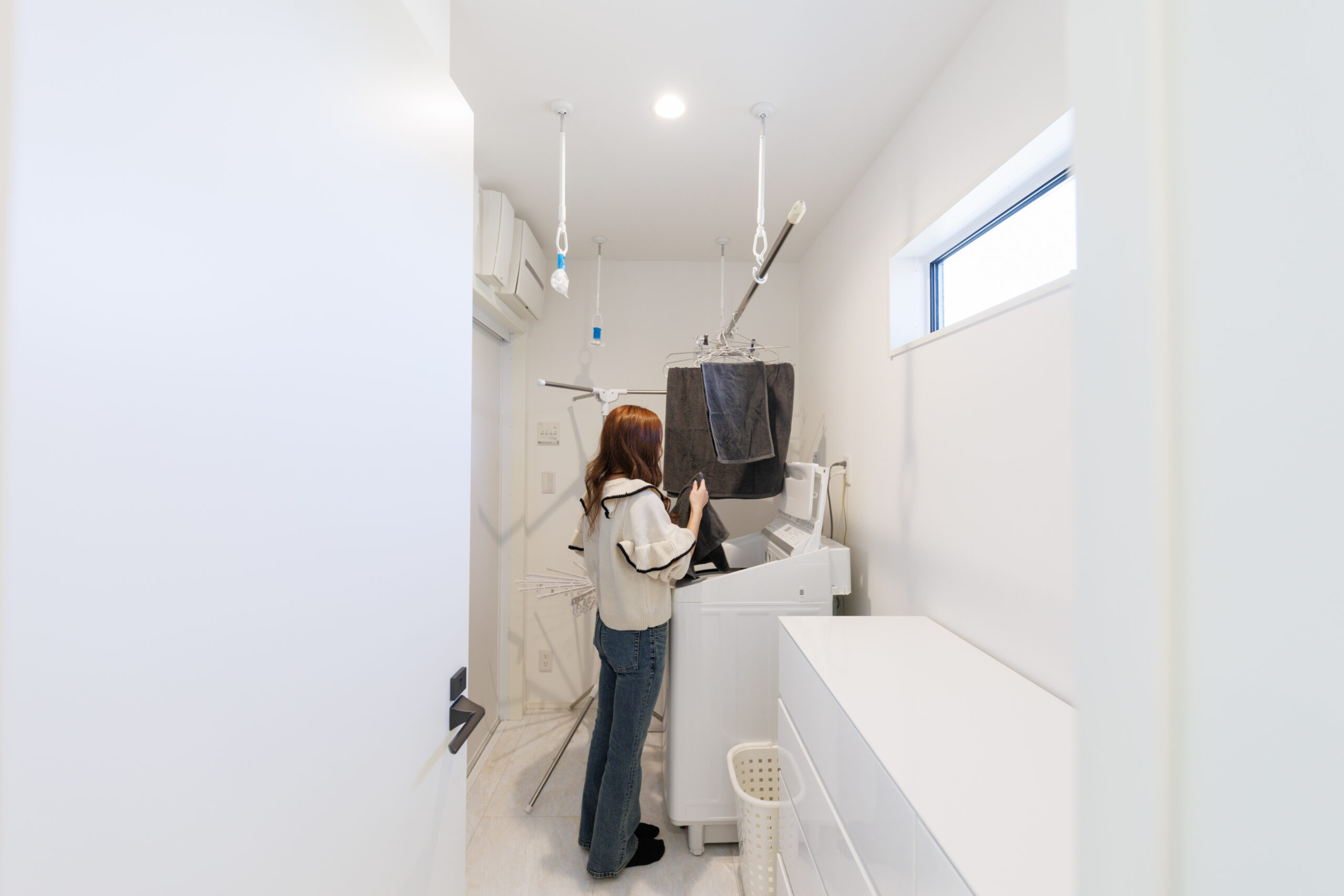 天候を気にせず干せる、白基調の清潔なランドリールーム。唯一の「もっとこうすれば」は、奥まりすぎた浴室用スイッチの位置。細かな動線確認の大切さを教えてくれる、リアルな家づくりのヒントが詰まった空間です。
