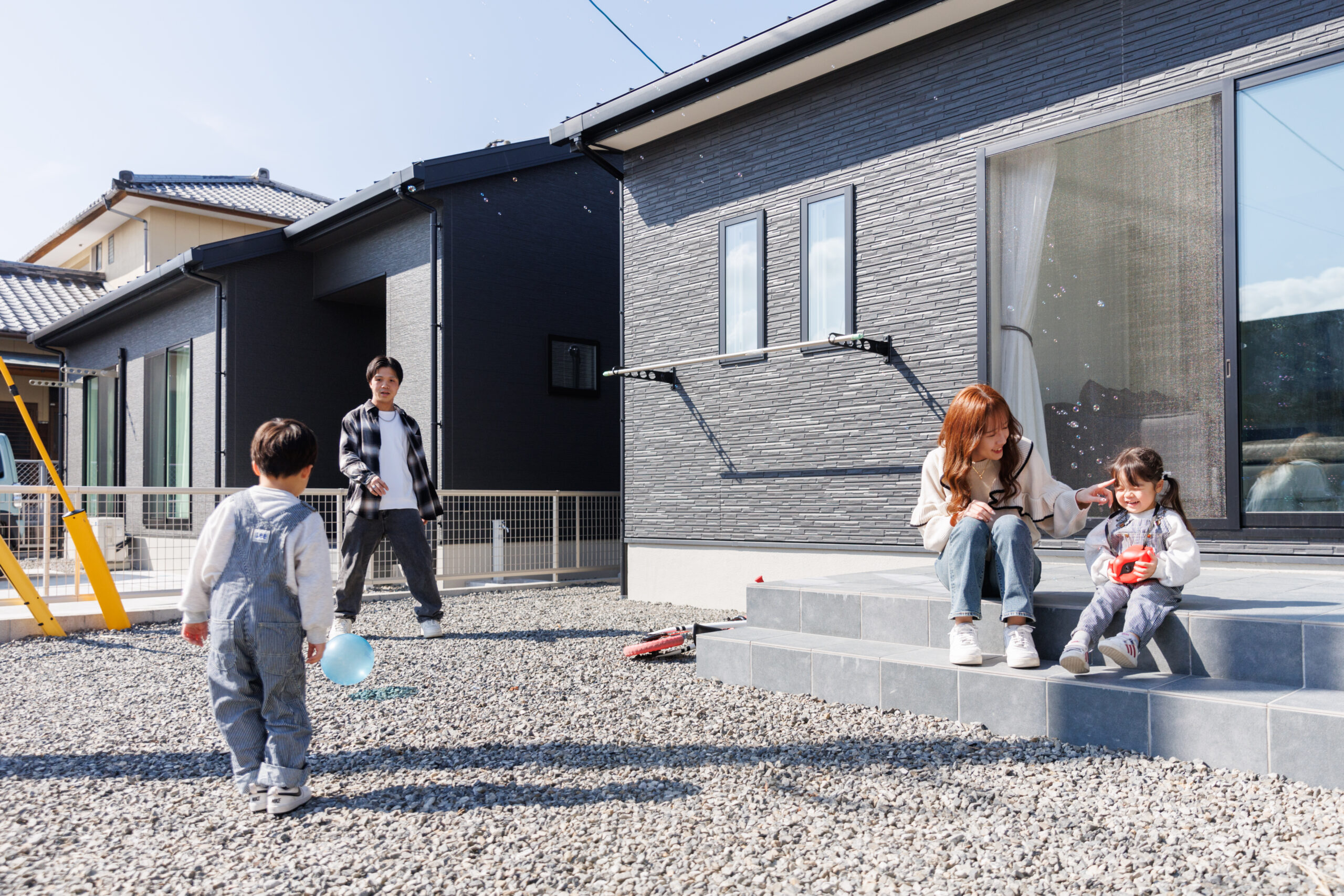 目の前は区画の特性上、車の出入りが少なく、思い思いの遊び方で過ごすご家族の皆様。 掃き出し窓付近に設置したタイルデッキに腰をかけて、“ひなたぼっこ”も気持ちよさそう♪