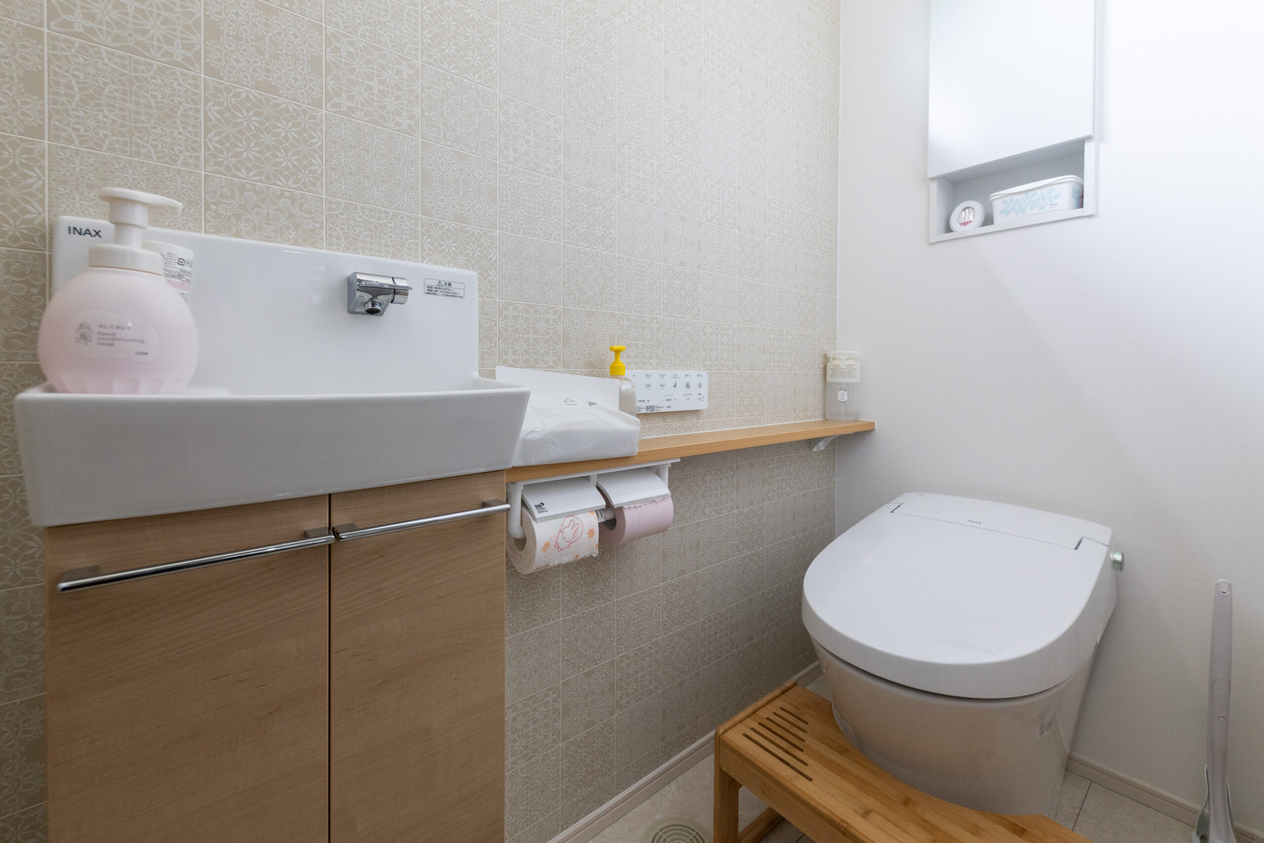 優しい柄の壁紙と木目のアイテムが、リラックスできる雰囲気を演出。タンクレストイレと独立手洗い器を採用し、ゆとりある広さとお手入れのしやすさを両立しました。壁面ニッチ収納も備えた実用的で美しい空間です。