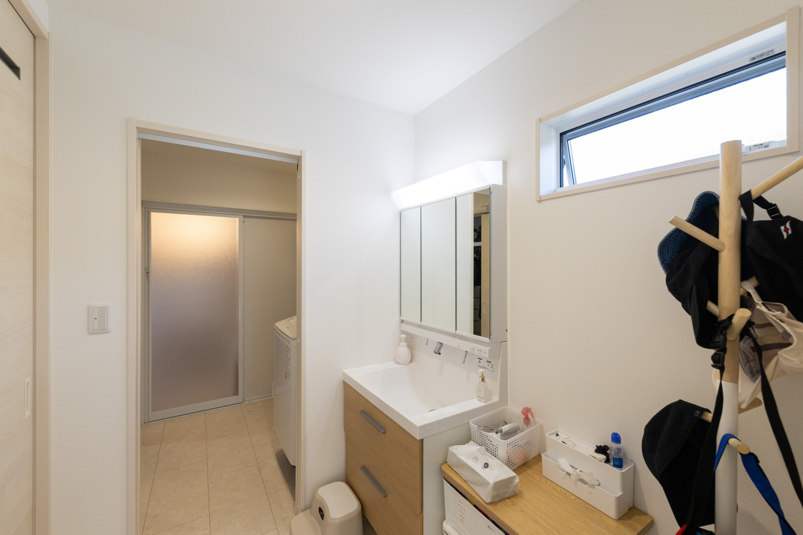 白を基調とした室内に、木目調の洗面台が温かみを添える清潔感あふれる空間です。プライバシーに配慮した高窓からは明るい光が差し込みます。奥の水回りへと繋がるスムーズな動線が、日々の暮らしを快適にします。