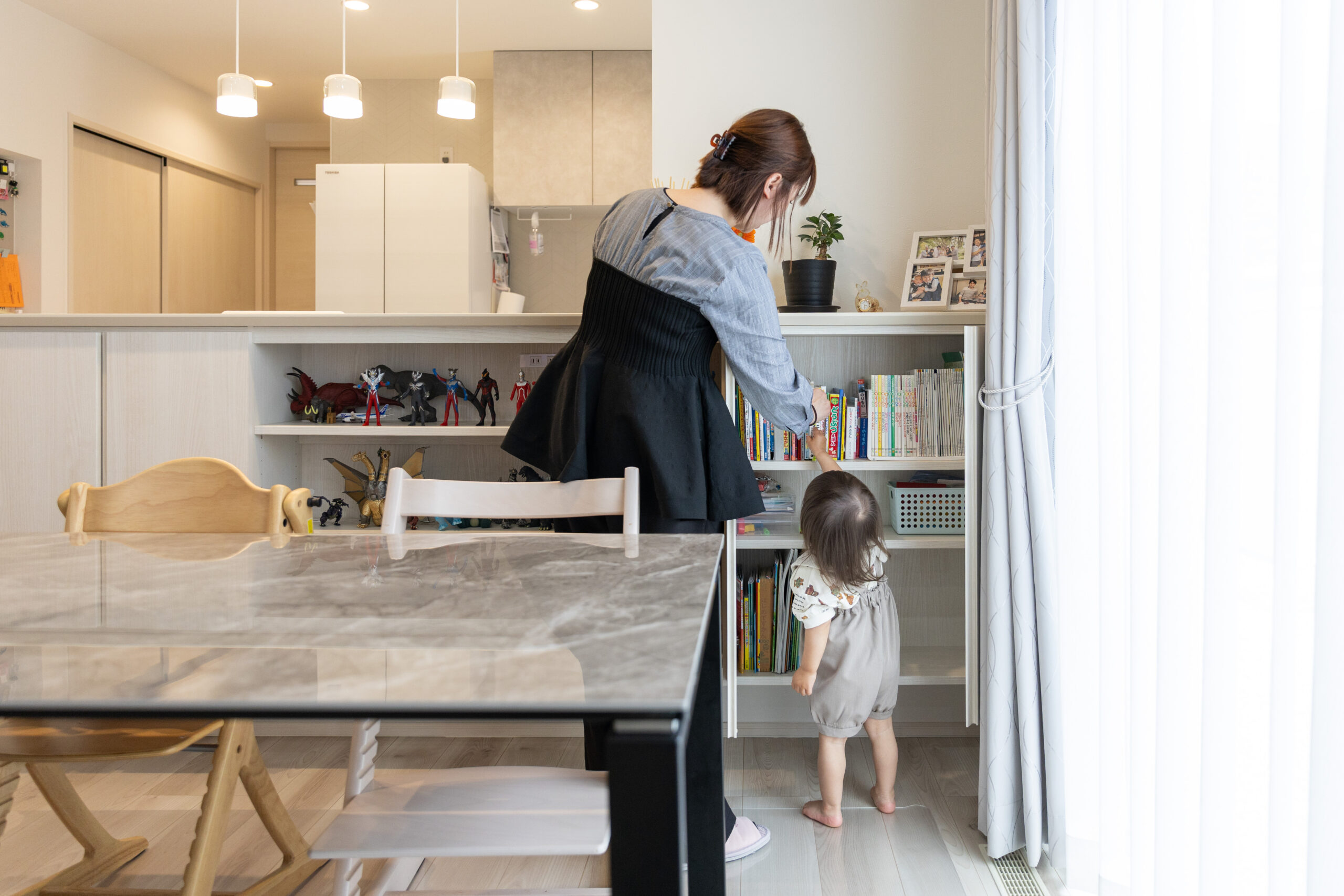 明るい窓辺のダイニングに設けた、使い勝手抜群のカウンター下収納。お子様の目線に合わせた高さで、絵本の出し入れもスムーズに行えます。見せる収納と隠す収納を組み合わせ、LDKの美しさと利便性を両立しました。