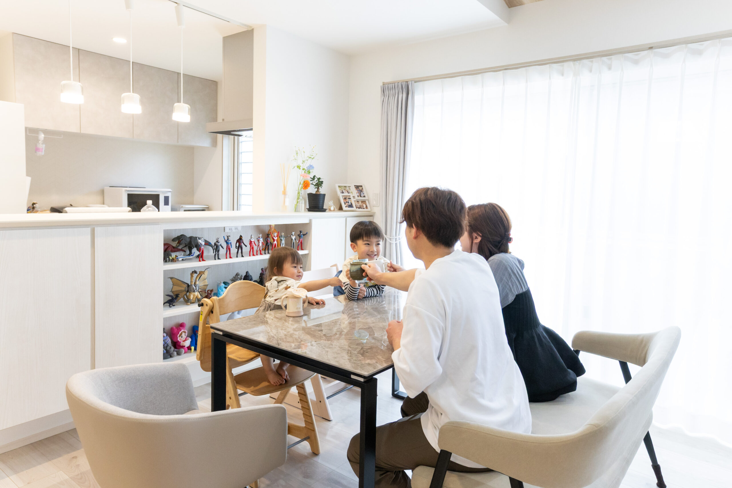 大きな窓からたっぷりの自然光が降り注ぐ、明るく開放的なダイニング。キッチンカウンター下の造作棚にはおもちゃが並び、遊び心と使い勝手を両立しています。こだわりの照明が彩る、居心地の良い空間です。