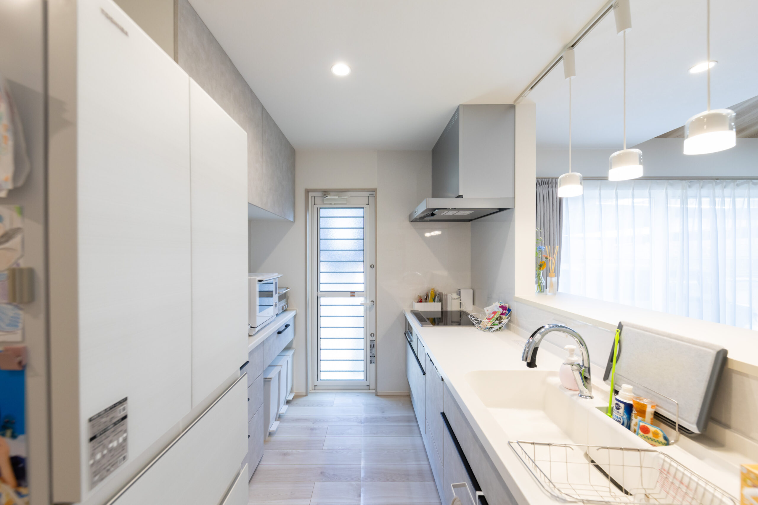 白と淡いグレーで統一された、清潔感あふれるキッチンスペース。勝手口から自然光が差し込む明るい空間です。大容量の背面収納やゴミ箱スペース、ゆとりある通路幅を備え、毎日の家事をスマートにサポートします。