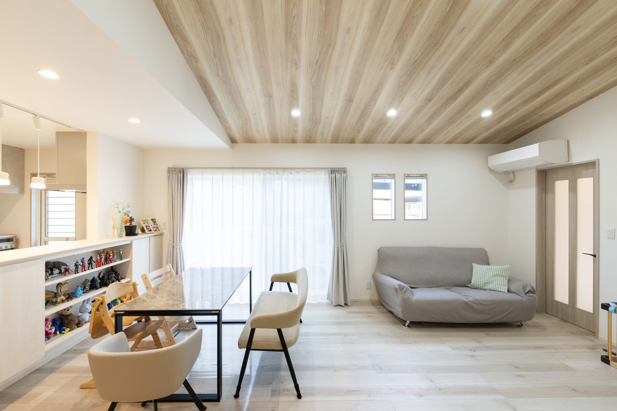 空間に広がりを持たせる木目調の天井が印象的なLDK。白と淡い木目で統一された明るい室内に、カウンター下の「見せる収納」がご家族の個性をプラス。大好きなものに囲まれて心地よく過ごせる憩いの空間です。