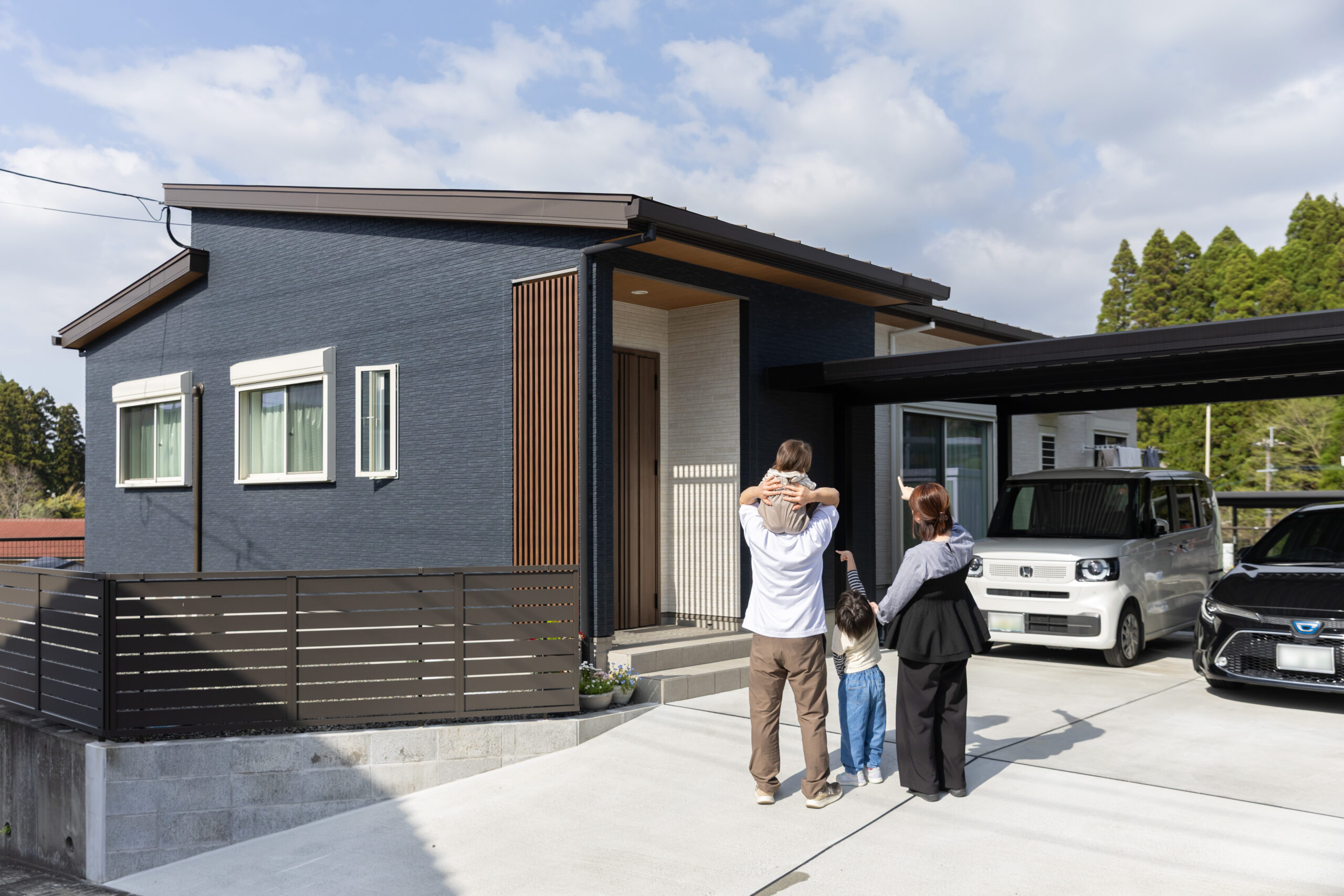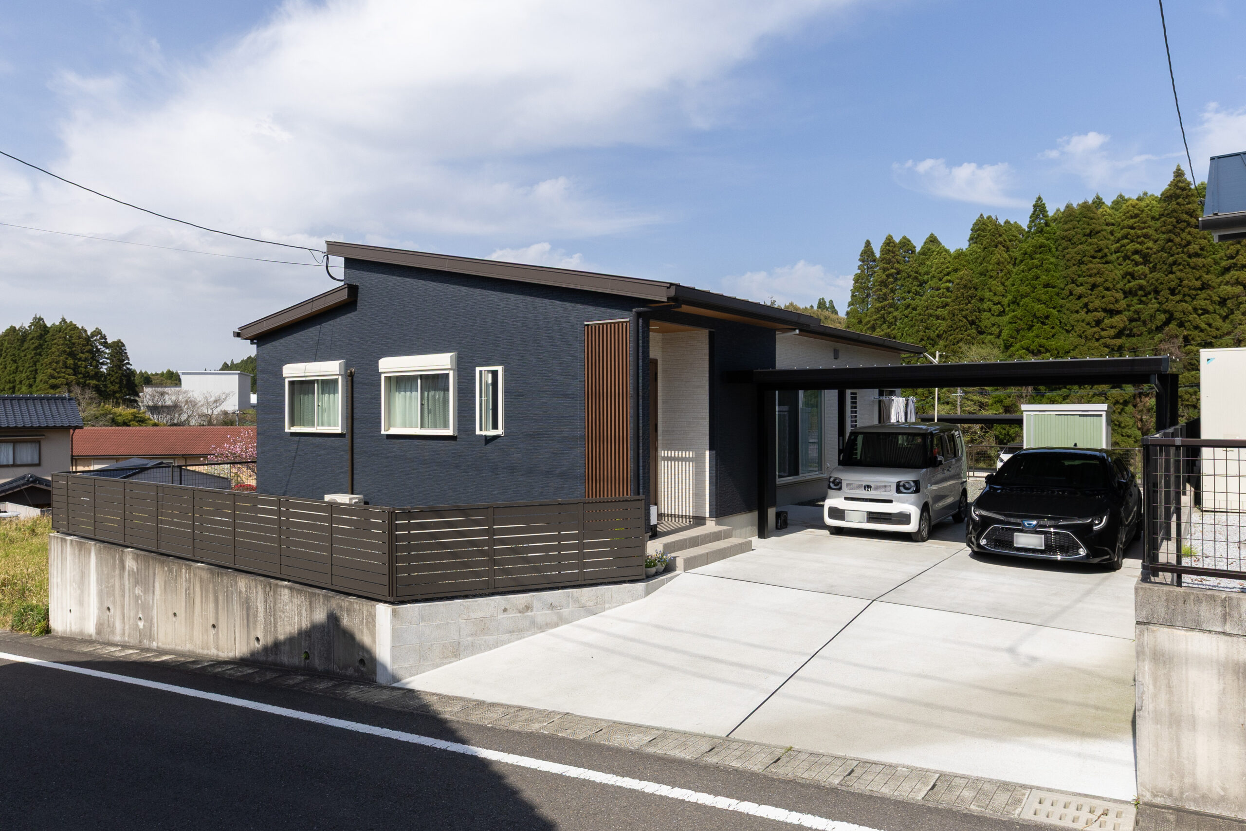 深みのあるダーク外壁とシャープな片流れ屋根が目を惹く外観。建物と一体化した実用的な大型カーポートを備え、雨の日のスムーズな動線を実現しています。背景の緑豊かな自然環境とも美しく調和する一邸です。